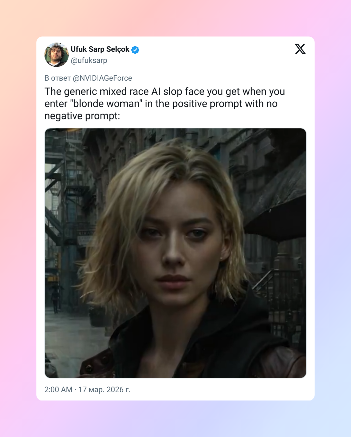 Типичное сгенерированное ИИ лицо «смешанной внешности», которое получается, если просто написать blonde woman в позитивном промпте и не задать негативный.