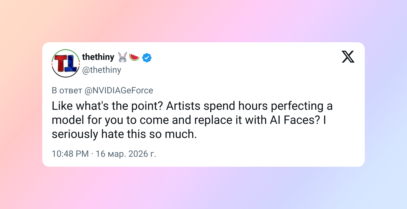 В чём вообще смысл? Художники тратят часы, доводя модели до идеала, чтобы потом всё это заменили на ИИ-лица? Меня это бесит до невозможности.