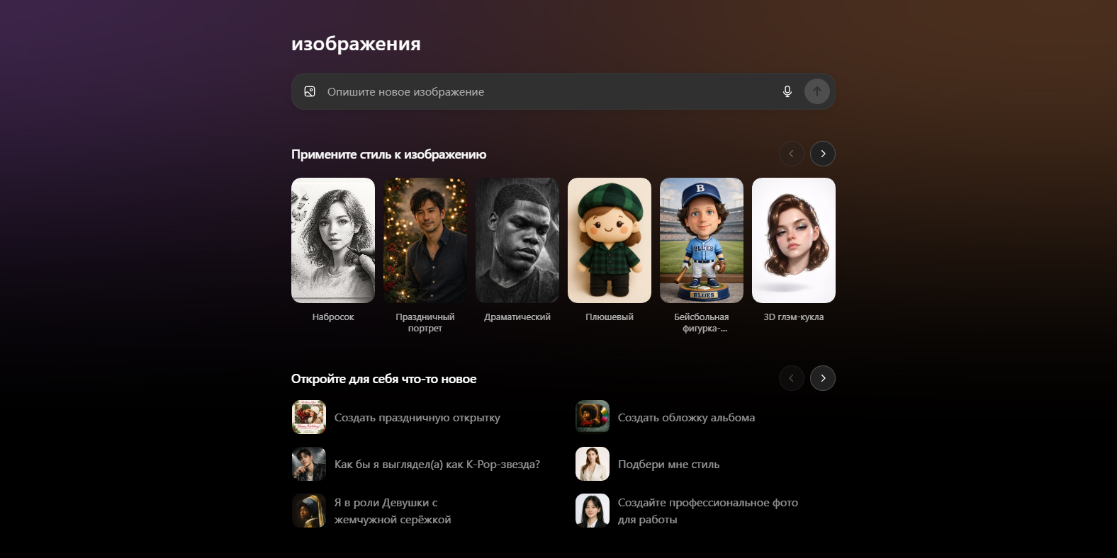 Ещё одно нововведение — пространство «Изображения» в боковом меню ChatGPT. В нём можно запускать генерацию и редактирование без написания сложных промптов, используя готовые стили и подсказки, которые будут регулярно обновляться.