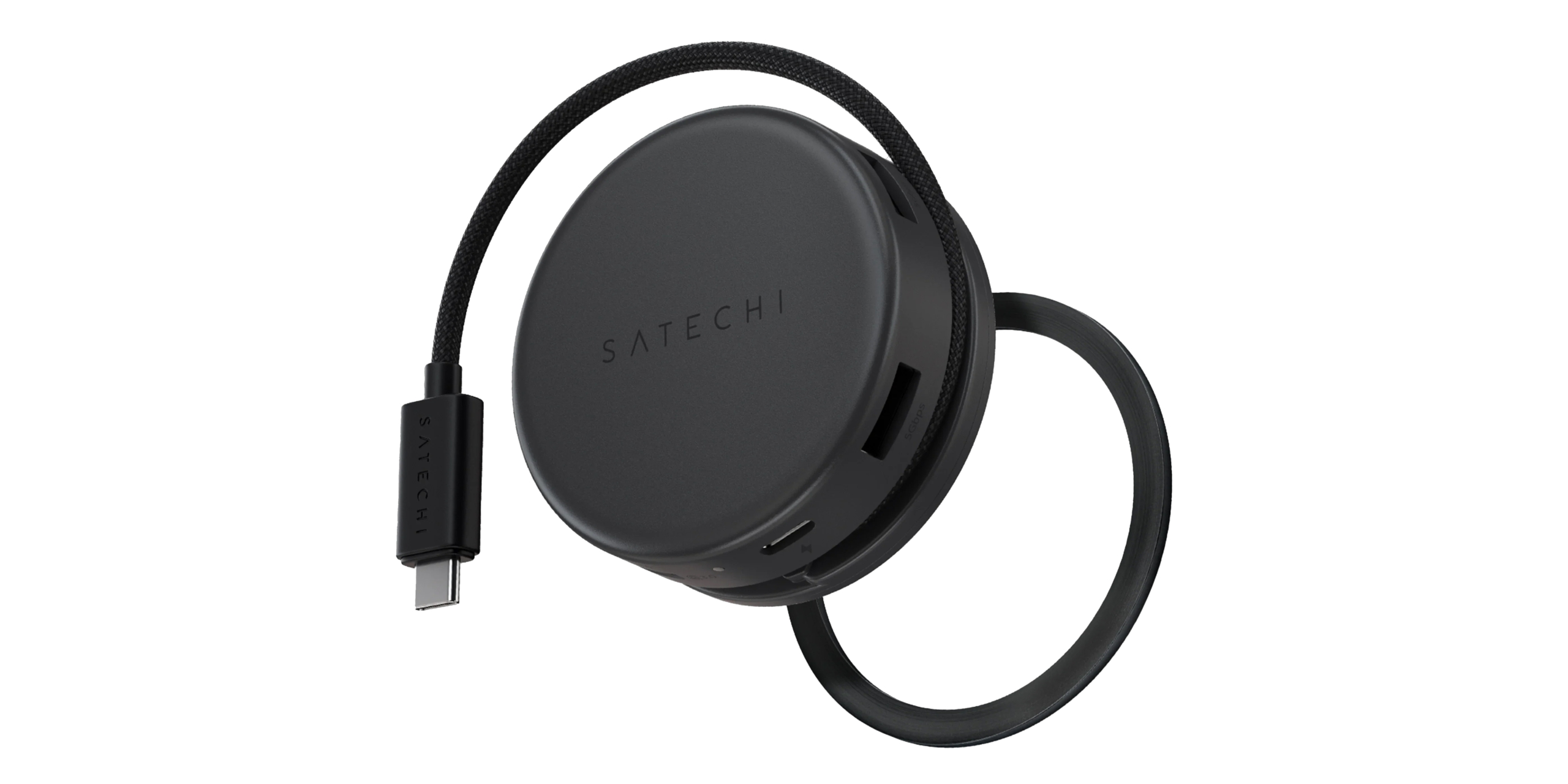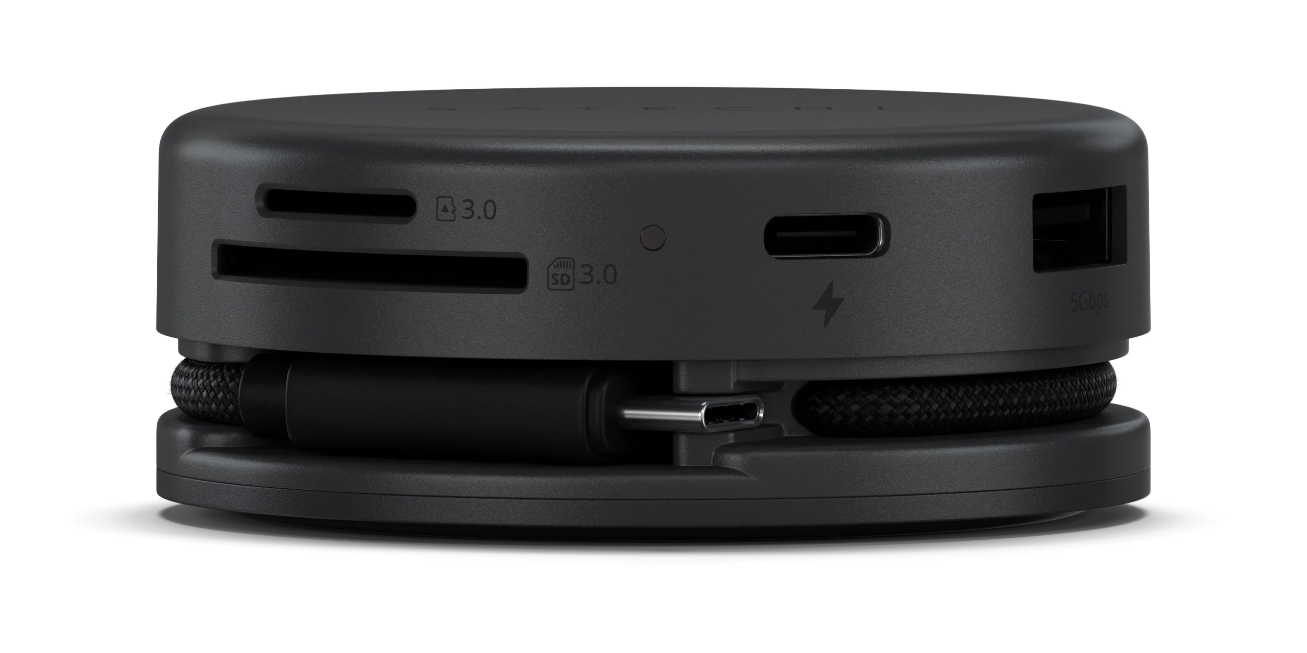 Satechi многопортовый адаптер под названием OntheGo 7‑in‑1, внешне похожий на хоккейную шайбу. Он крепится к смартфонам и ноутбукам с помощью магнитов, но при этом не работает как беспроводная зарядка, а выступает как хаб. Короткий встроенный кабель USB‑C для подключения к мобильному устройству фиксируется вокруг корпуса, когда не используется.