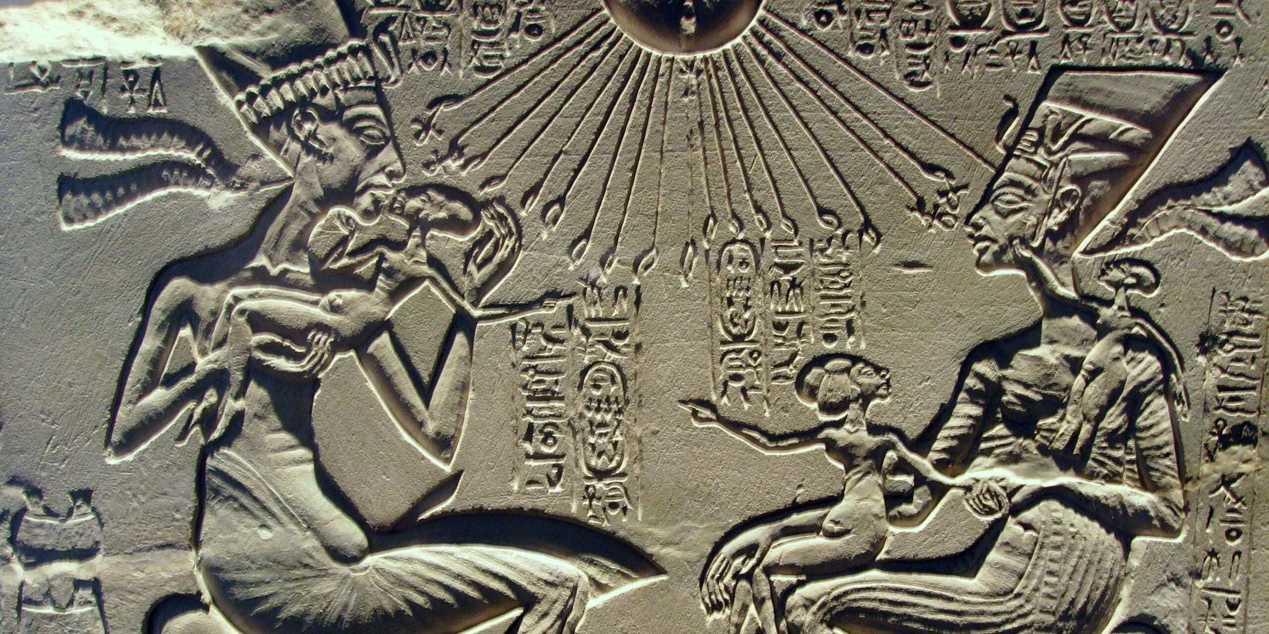 Нефертити была «главной супругой» фараона Эхнатона, правившего в период около 1351–1334 годов до нашей эры. Он был инициатором религиозной реформы, прозванной «солнцепоклонническим переворотом», в рамках которой главным божеством провозгласили бога Атона (солнечный диск, зримая форма Ра).
