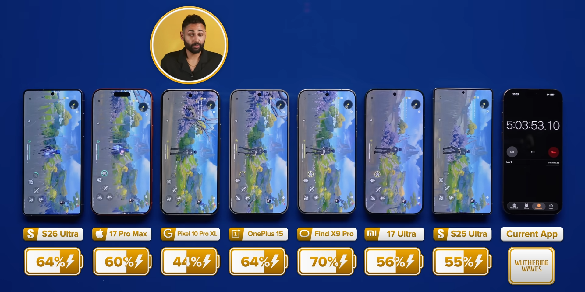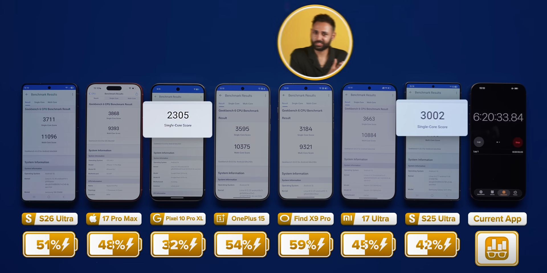 Ведущий популярного YouTube-канала Mrwhosetheboss автономность и производительность новенького Samsung Galaxy S26 Ultra с его предшественником, а также главными конкурентами — iPhone 17 Pro Max, Google Pixel 10 Pro XL, OnePlus 15, Oppo Find X9 Pro и Xiaomi 17 Ultra.