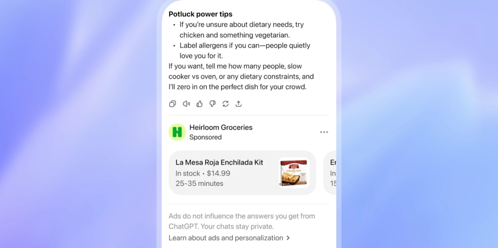Пользователи нередко обращаются к ChatGPT, когда исследуют возможные варианты, сравнивают идеи и формируют решение. В эти моменты реклама становится способом познакомить людей с продуктами и сервисами, которые могут им понравиться, от компаний любого масштаба.