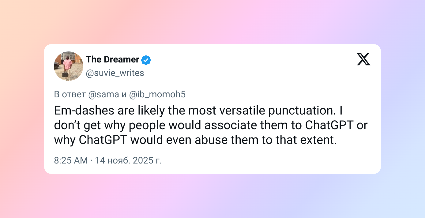 Длинное тире действительно один из самых удобных знаков. Не понимаю, почему люди связывают его с ChatGPT или почему модель так злоупотребляла им.