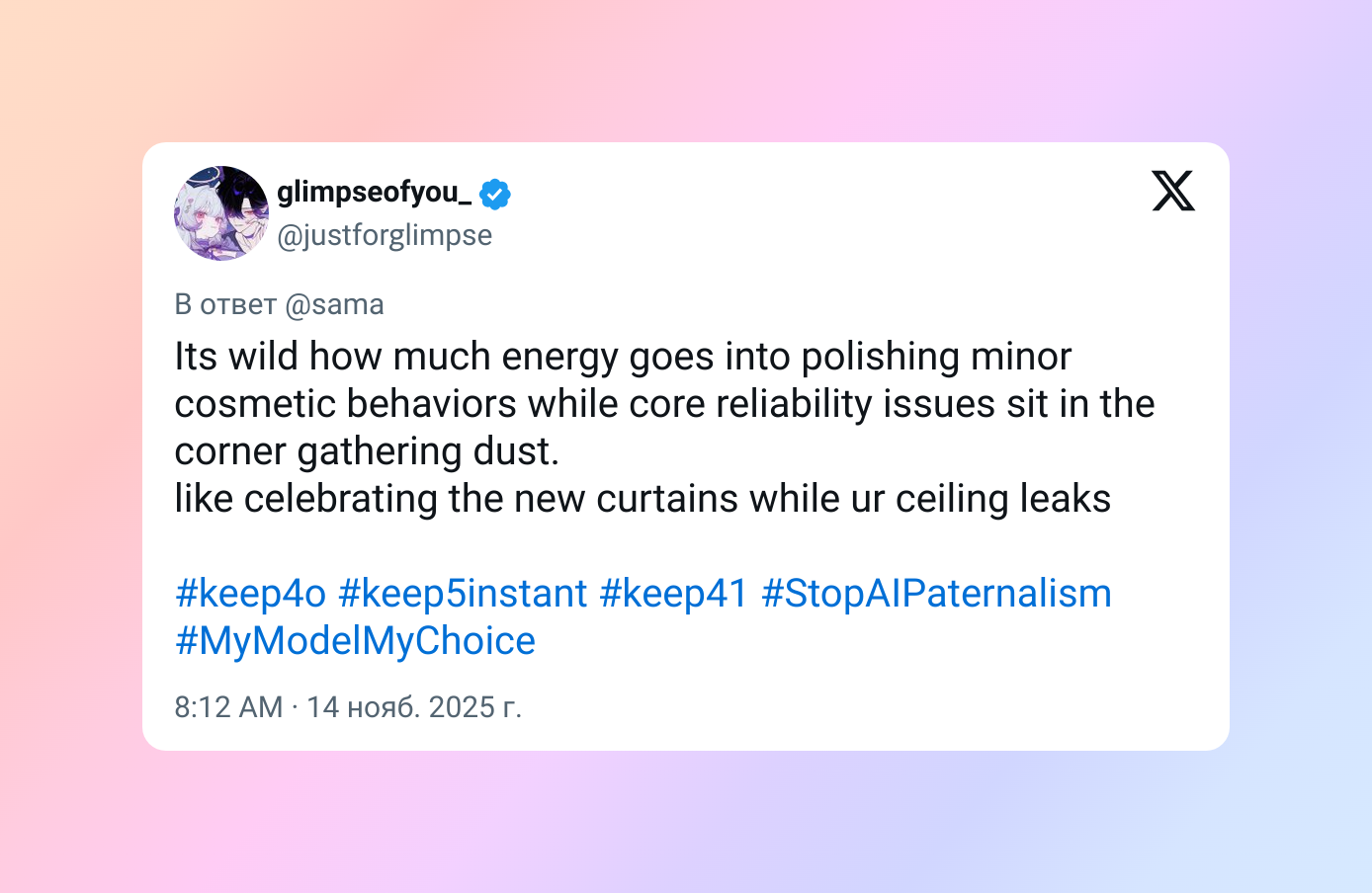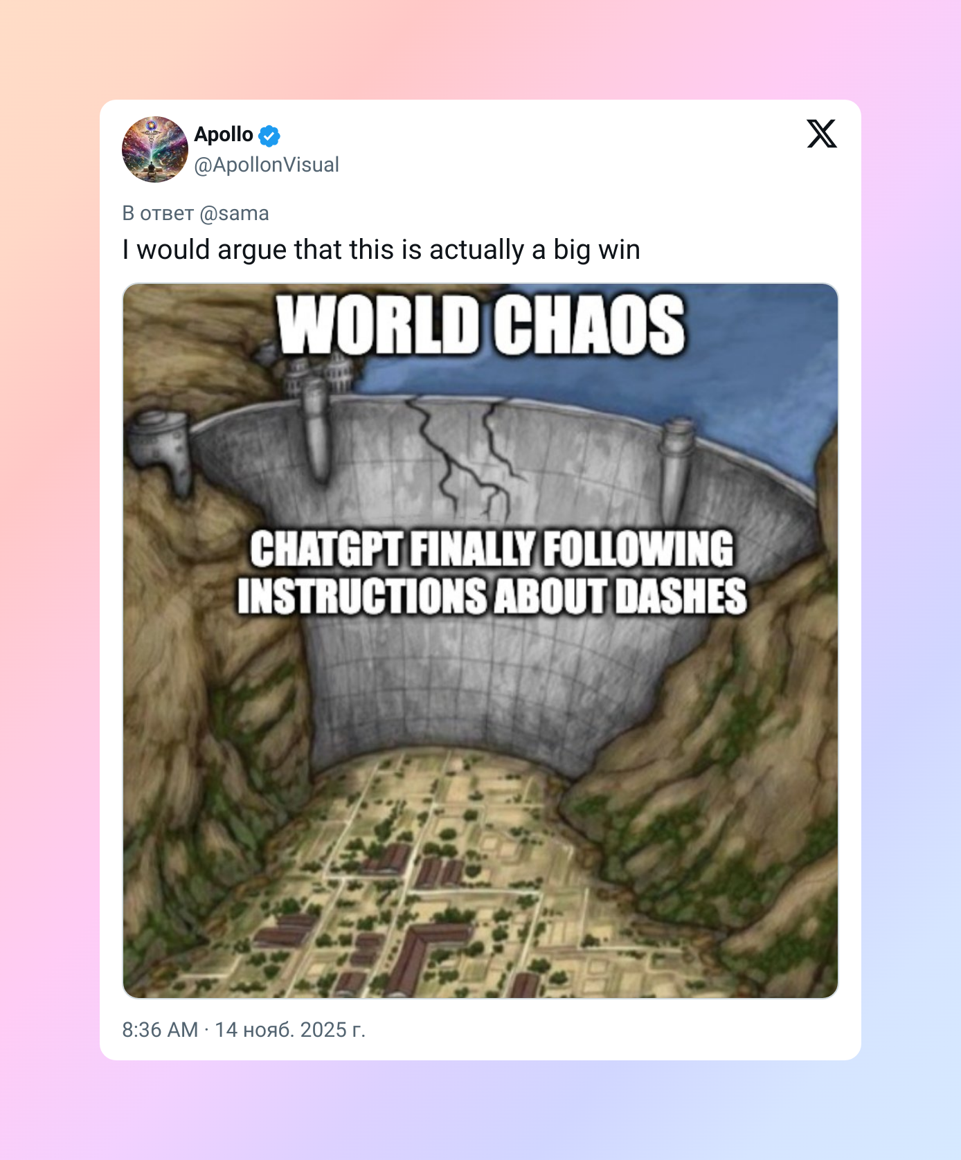 Проблема с навязчивым использованием чат-ботом длинного тире обсуждалась давно. Многие говорили, что наличие символа в тексте сразу наводит на мысли о том, что автор использовал нейросеть. Другие же подчёркивали, что этот знак препинания был популярен в литературе задолго до появления ИИ, а частота его использования моделью объясняется тем, что она училась на реальных человеческих текстах.