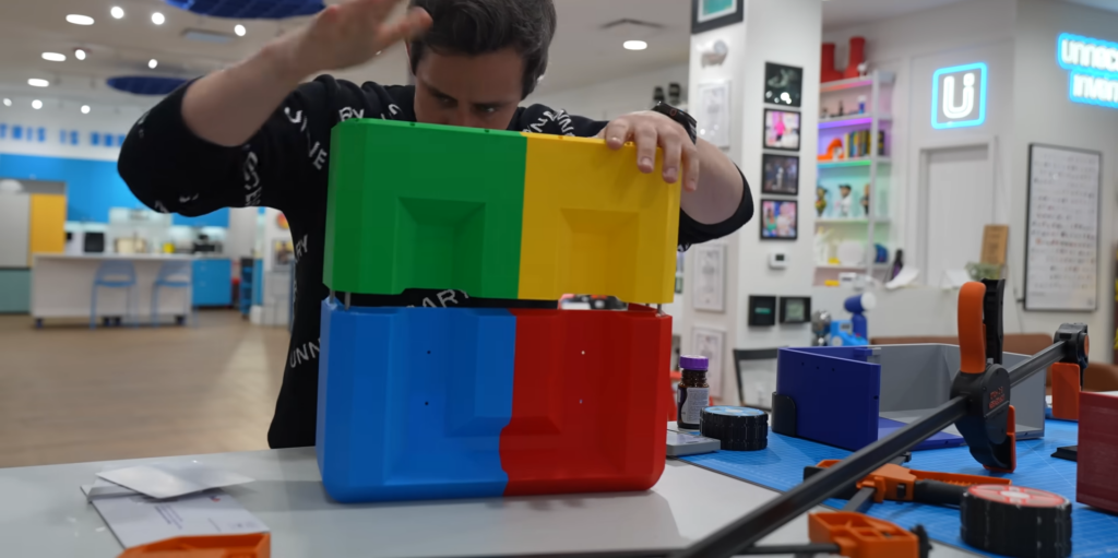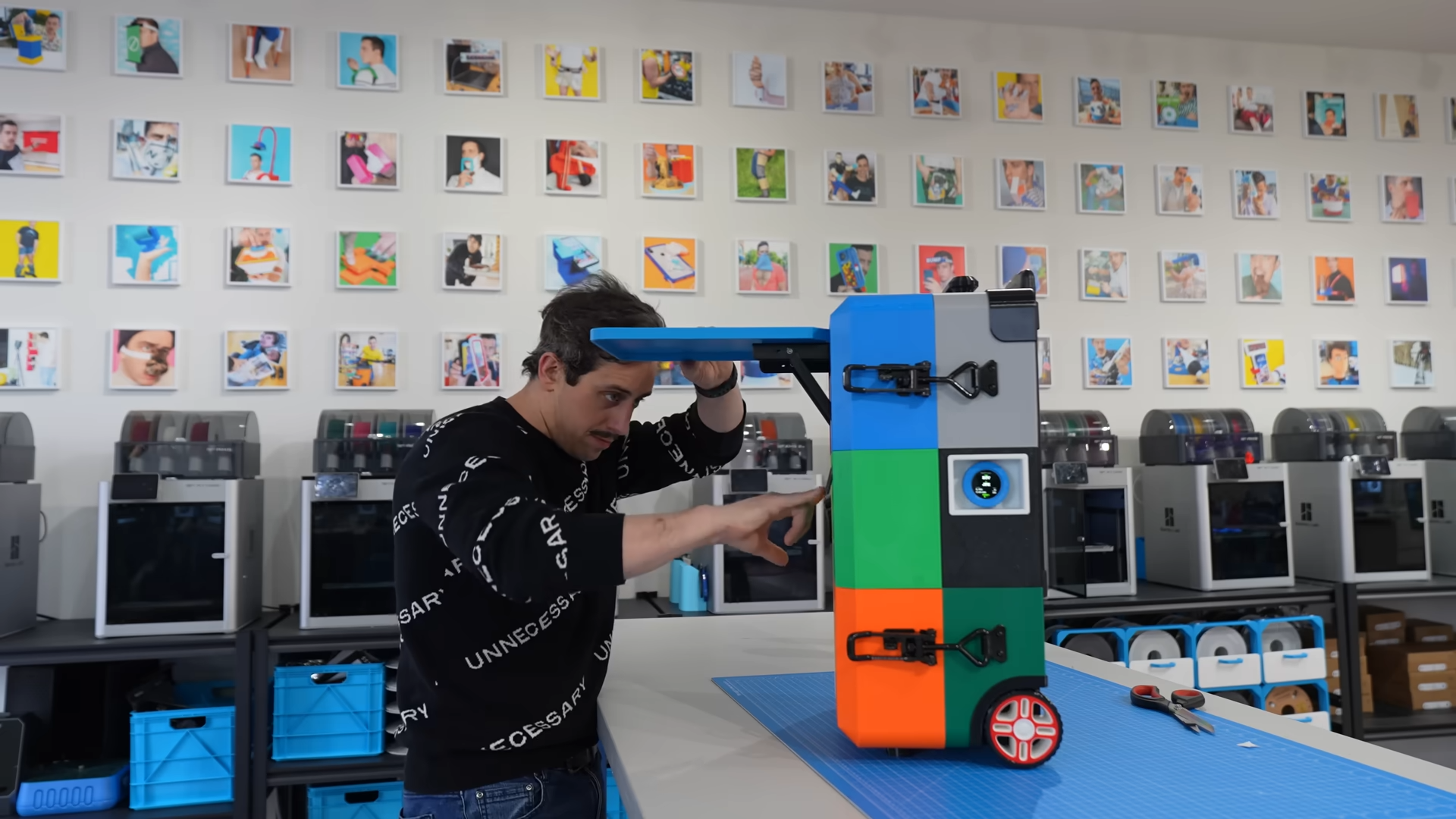 Корпус он напечатал на 3D‑принтере по частям, а затем собрал их в единую конструкцию, словно детали Lego, закрепив металлическими штифтами и клеем. Разумеется, не всё было создано с нуля: он добавил стандартные металлические петли, обычные колёсики и телескопическую ручку, которую можно выдвигать.