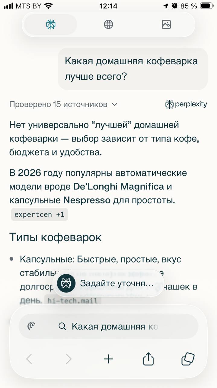 Поиск в Comet работает в гибридном формате: для простых запросов показываются классические результаты, а для более сложных подключается ИИ-движок Perplexity с развёрнутыми ответами и аналитикой.