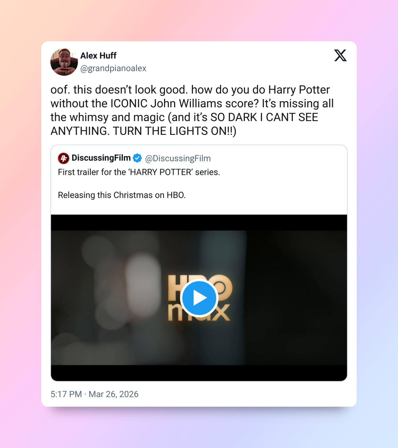 «Ой, это выглядит не очень хорошо. Как дела, Гарри? „Гарри Поттер“ без культовой музыки Джона Уильямса? Тогда в нём нет ни очарования, ни волшебства (и там так темно, что я ничего не вижу. Включите свет!!)».