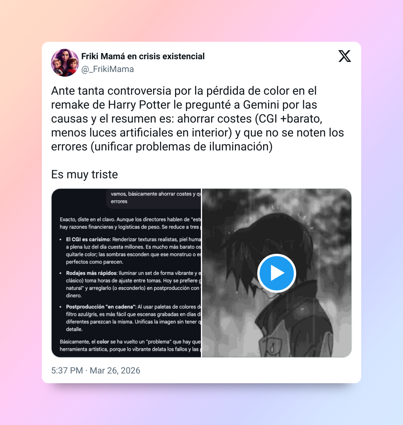 «Учитывая все споры вокруг потери цвета, я спросил у Gemini о причинах. Вкратце они сводятся к следующему: экономия бюджета (дешевле компьютерная графика и меньше искусственного света на площадке) и попытка скрыть огрехи (тёмная картинка делает их менее заметными)».
