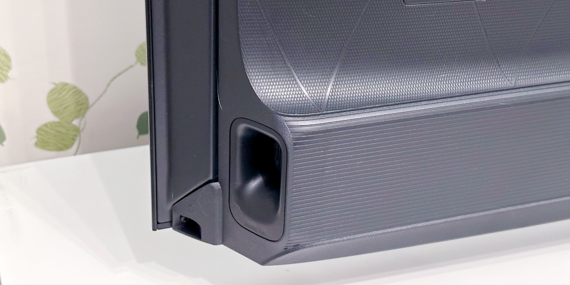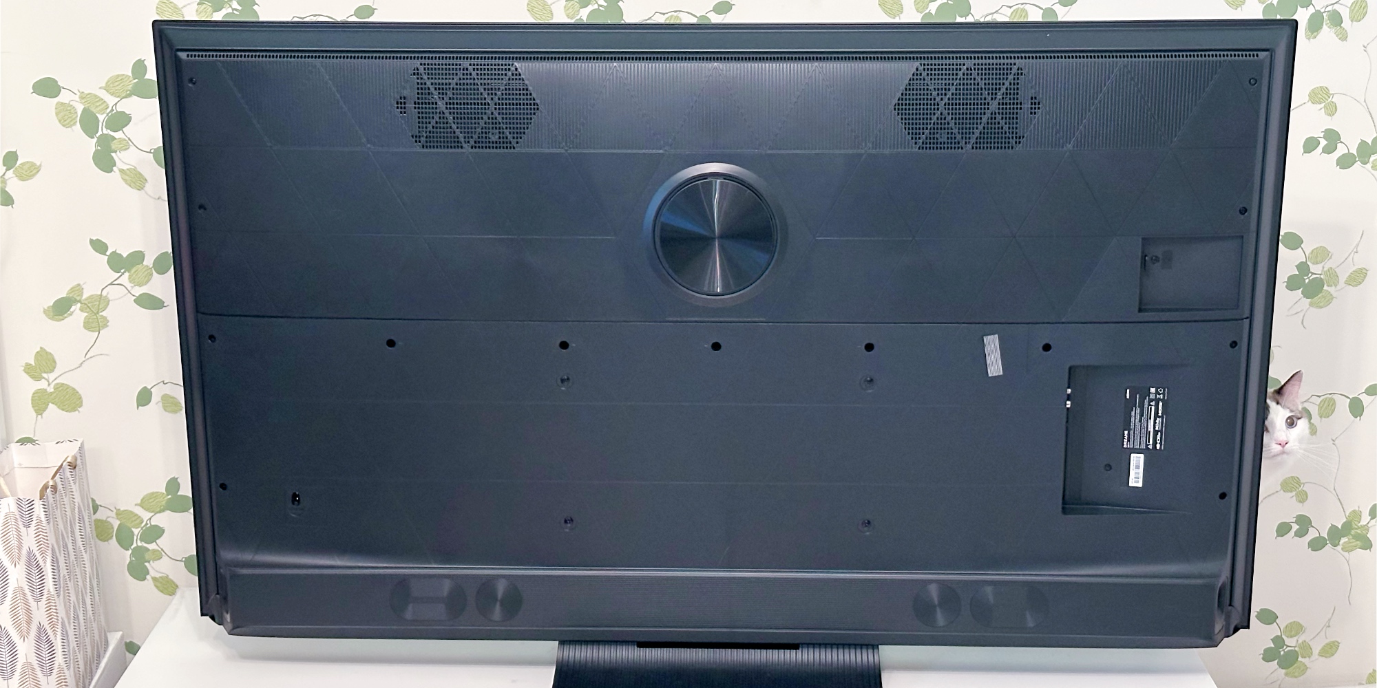 Задняя панель равномерная по толщине: здесь нет явно выпирающей зоны, в которую разместили начинку, компоненты распределены по всей поверхности. В глаза сразу бросаются кругляш сабвуфера и саундбар внизу, но о них поговорим чуть позже, когда дойдём до звука.