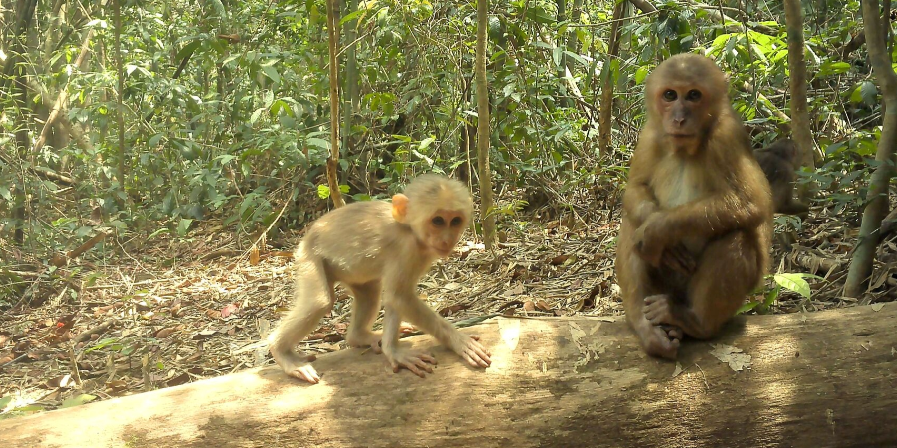 На снимке мать и детёныш устроились на поваленном дереве. Эти приматы легко узнаваемы по короткому, лишённому шерсти хвосту, и проводят большую часть дня за сбором упавших фруктов, которыми питаются.