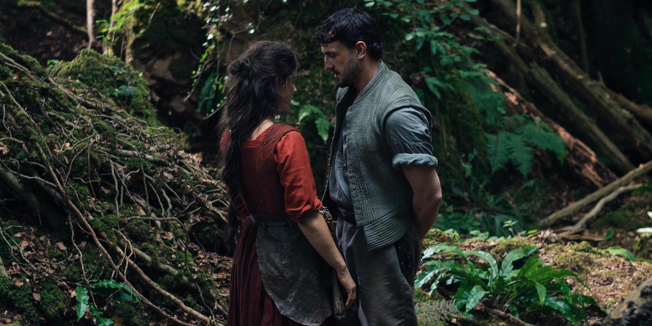 В «Хамнете» многие чувства тоже не проговаривают, а позволяют зрителю догадываться, что ощущают персонажи. Пол Мескал и Джесси Бакли в общих сценах часто молчат, обнимаются, смотрят в пустоту. Но их присутствие рядом друг с другом, само окружение и даже свет влияют на восприятие.