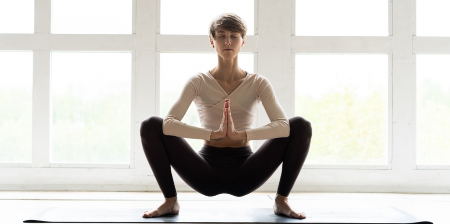 Ещё одно название асаны — «маласана». Если вы делаете упражнение в первый раз, лучше подготовьте стул. Он поможет держать равновесие.