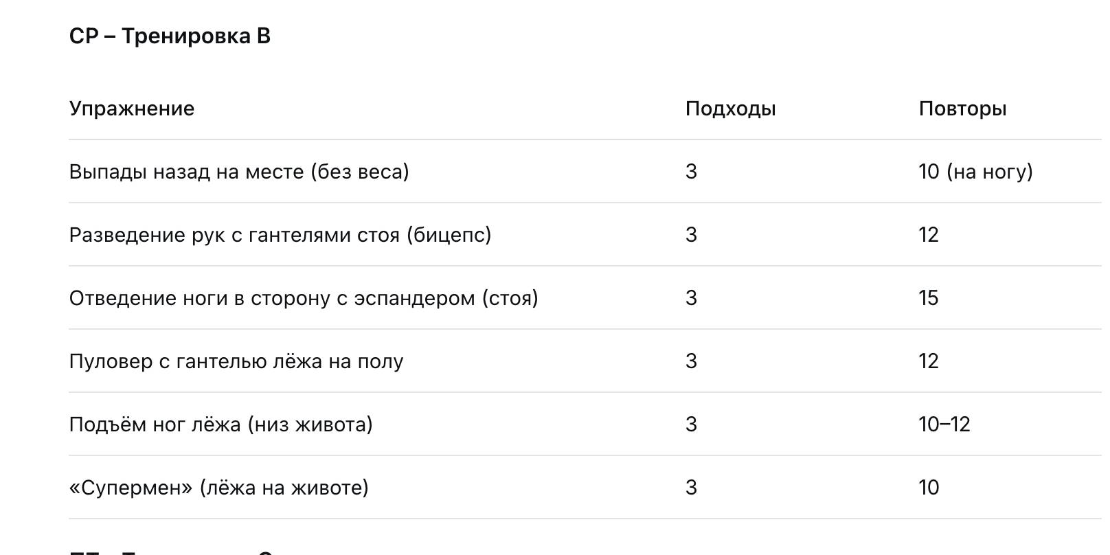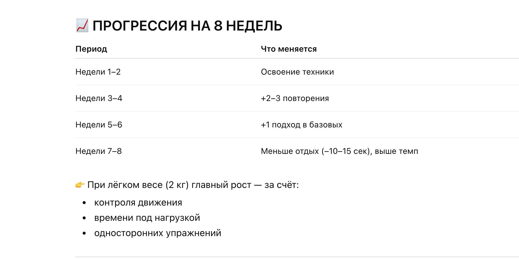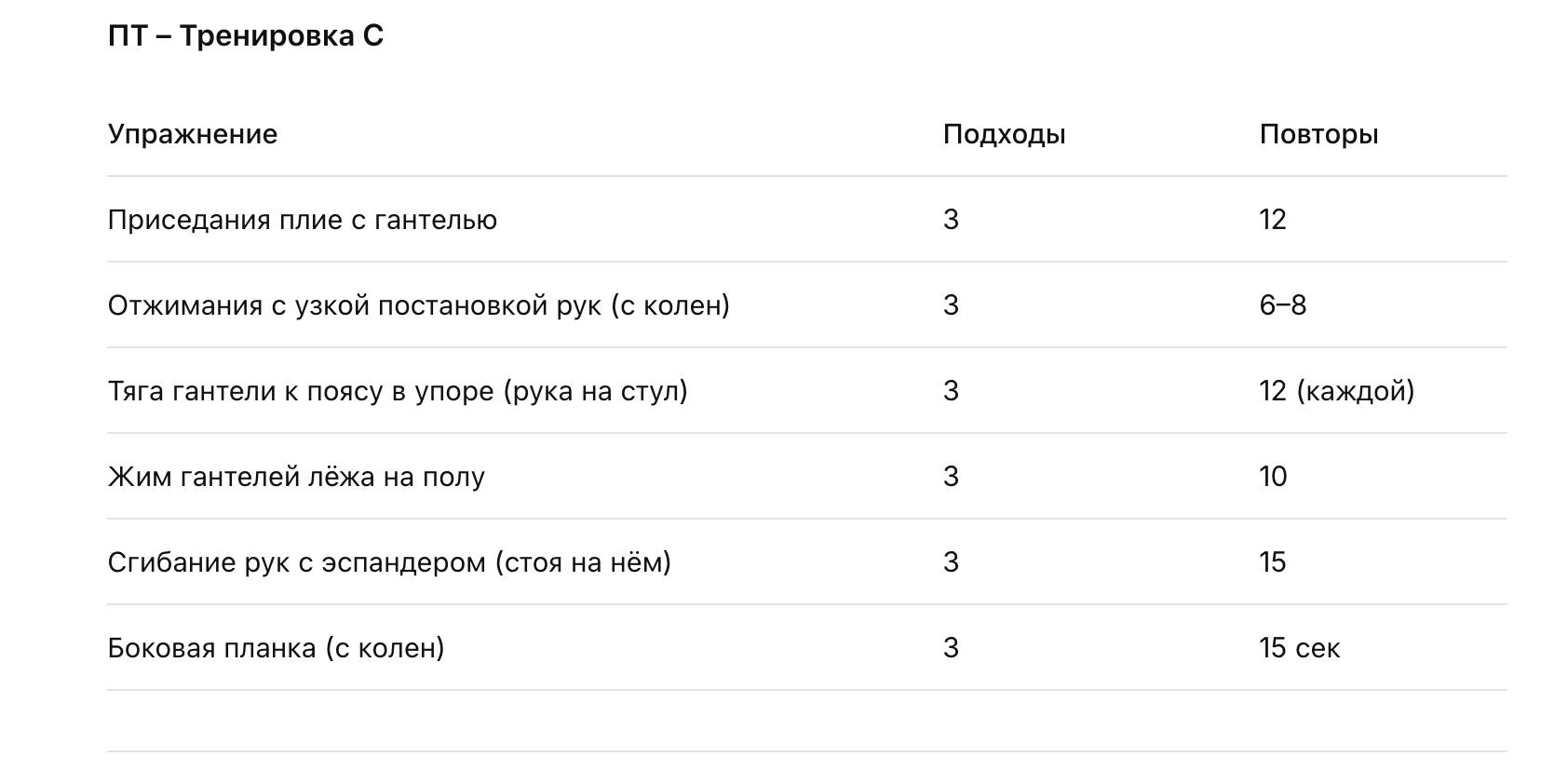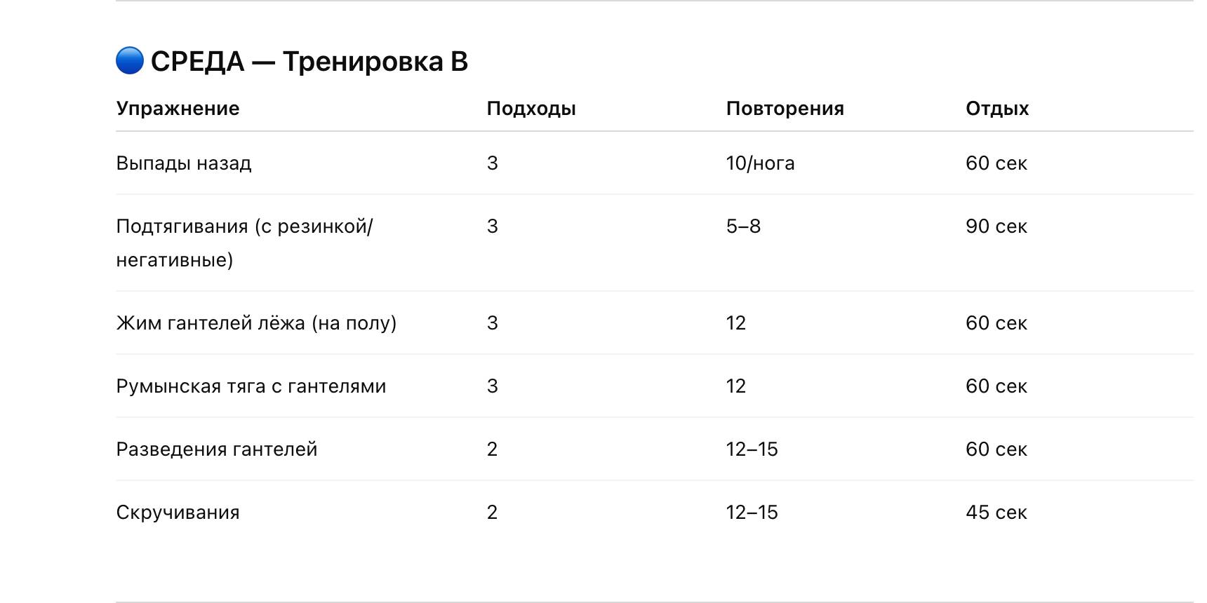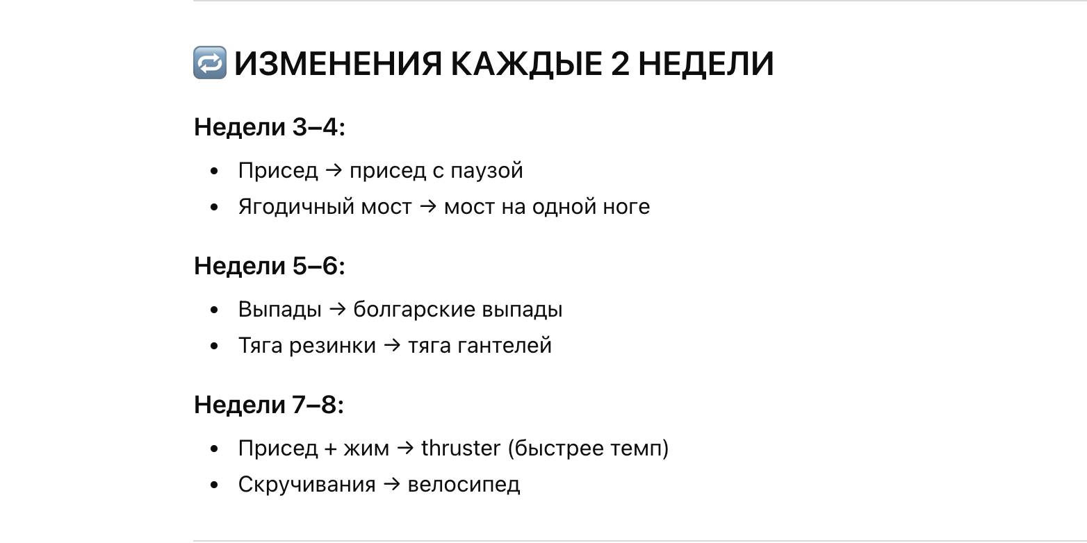 - Разнообразие: каждые 2 недели меняй 1–2 упражнения на другие.
