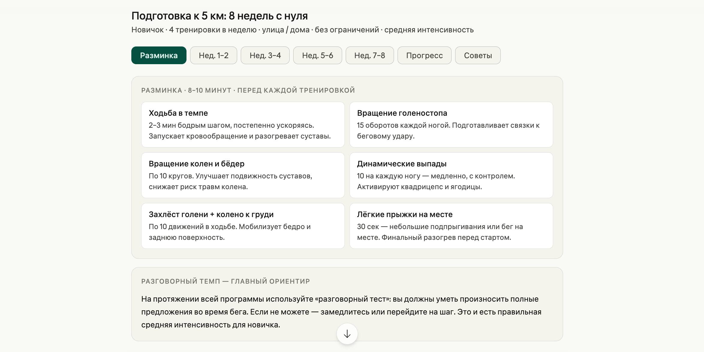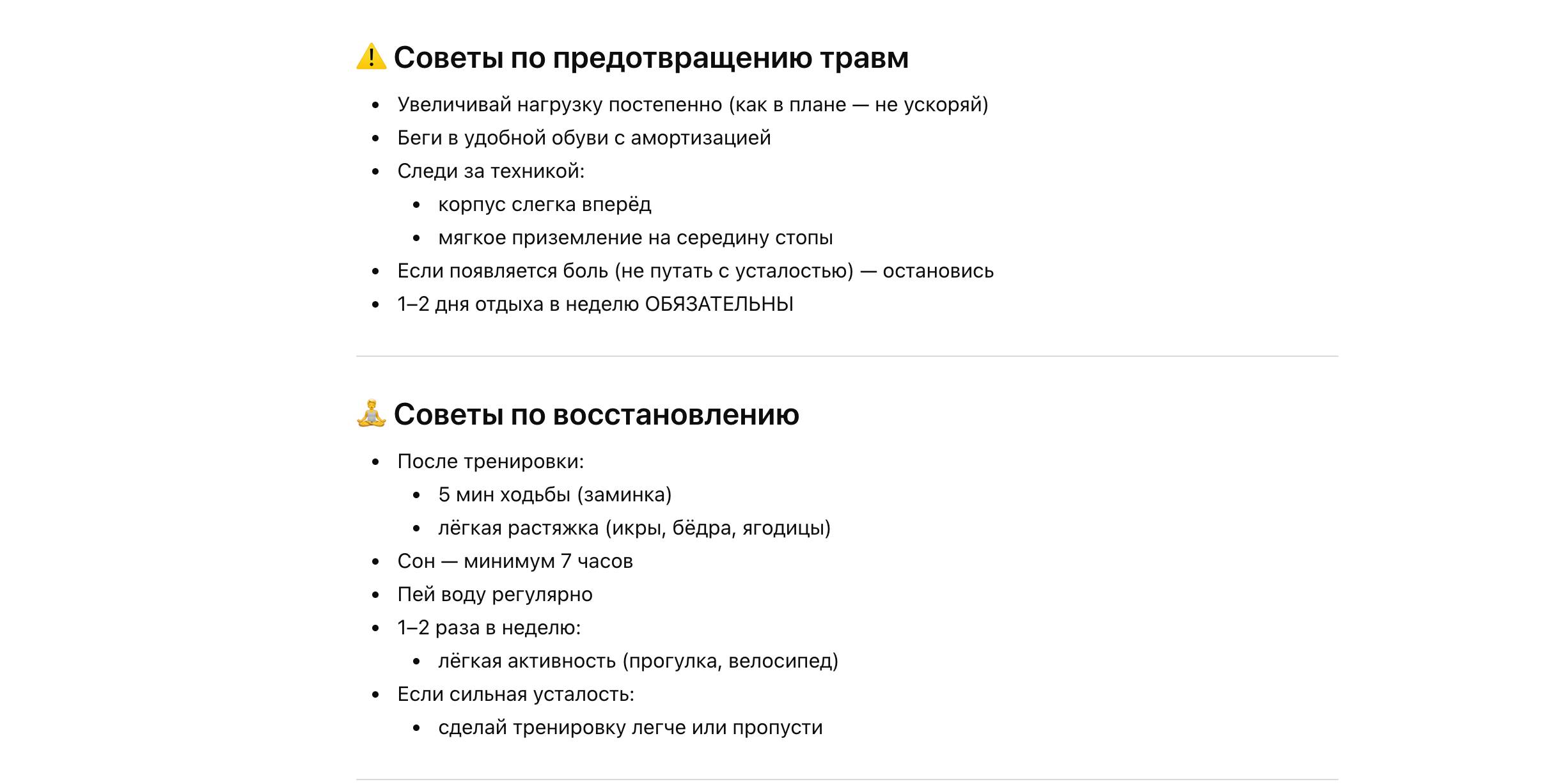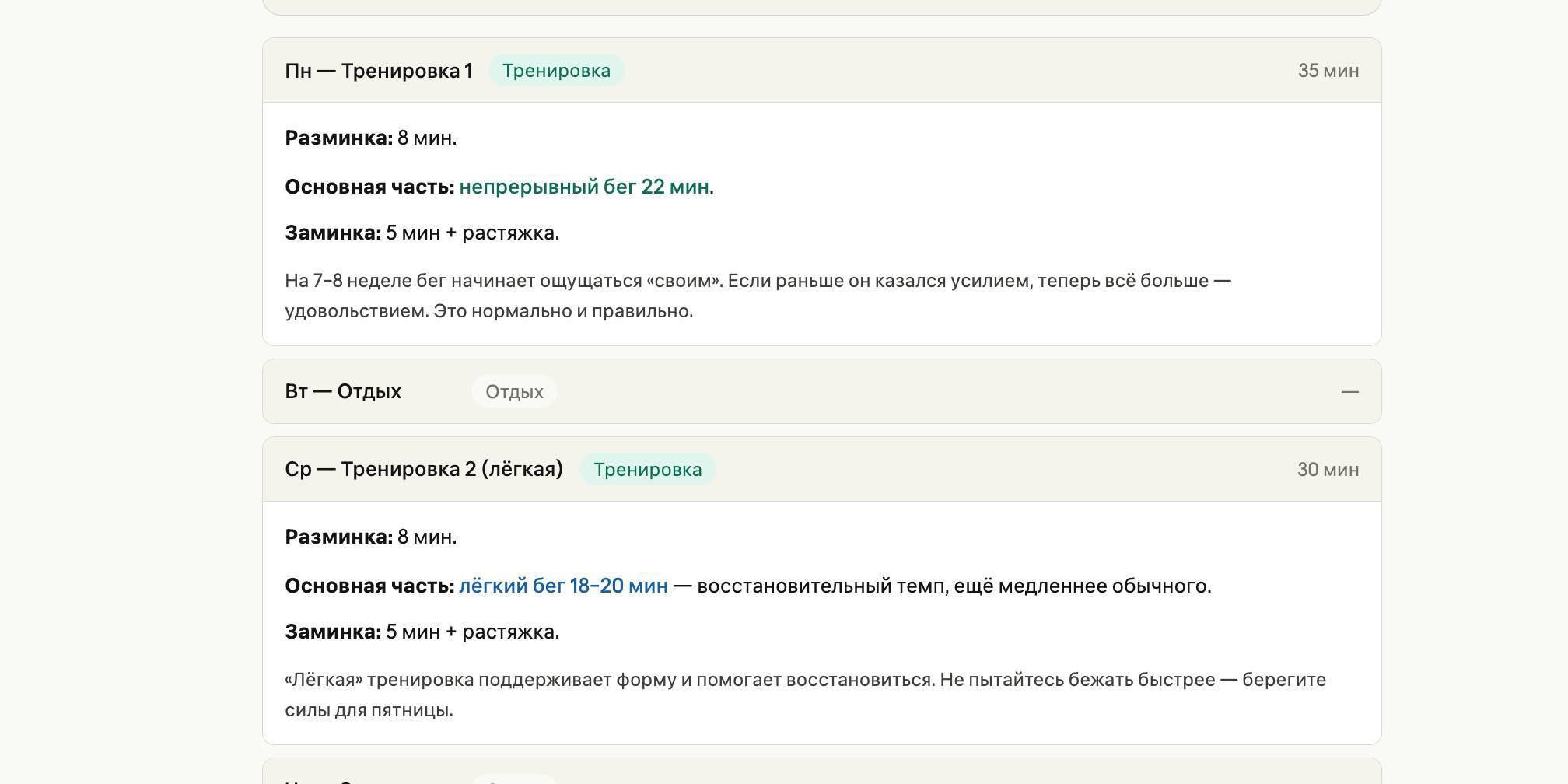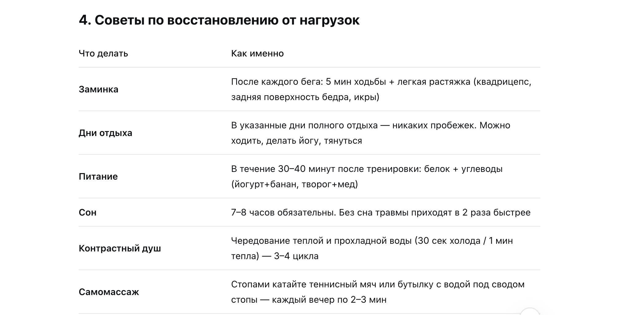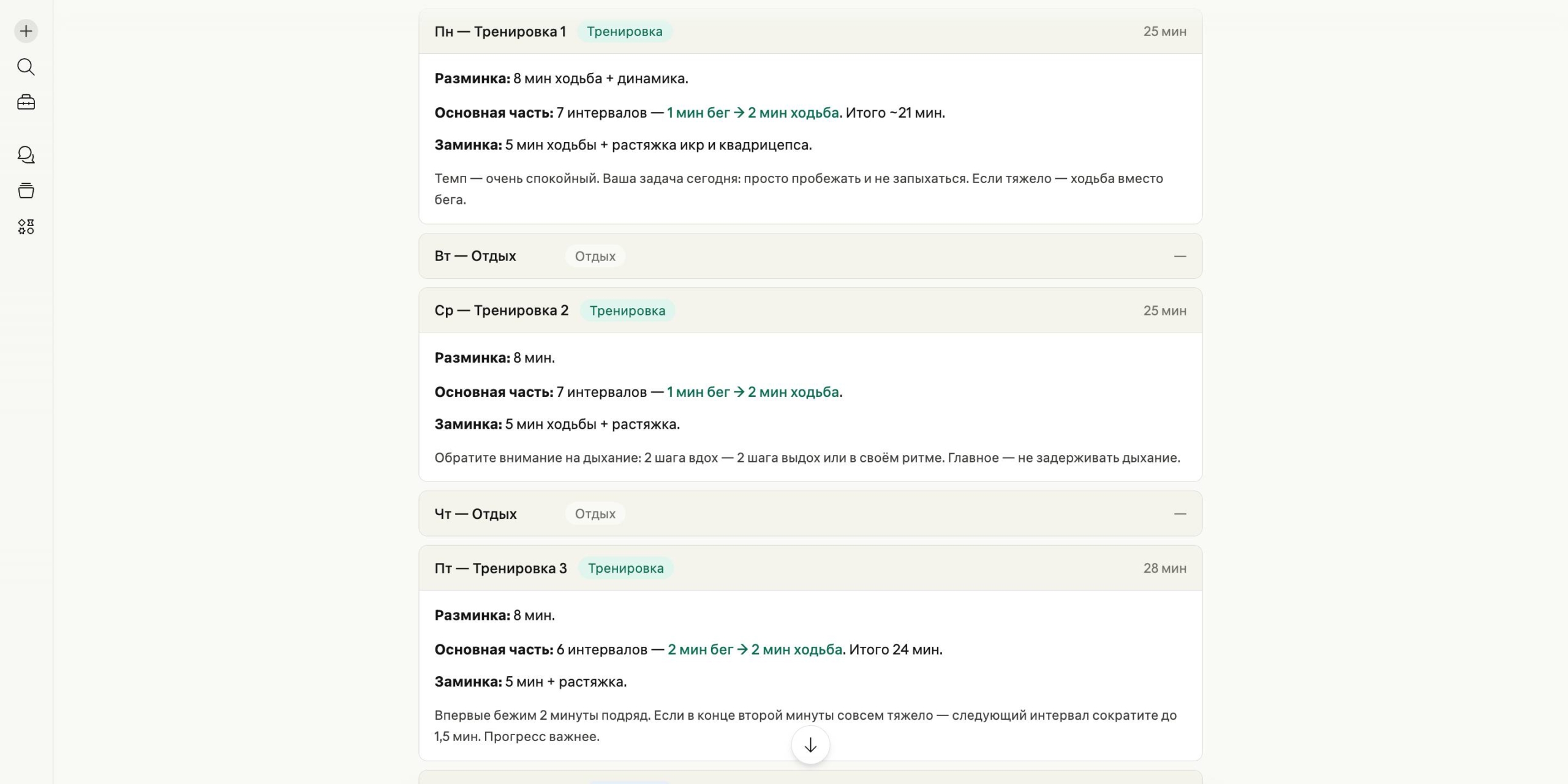 Claude дала более плавную прогрессию нагрузки, чем ChatGPT. В конце каждого тренировочного дня прописана заминка и небольшие полезные советы.