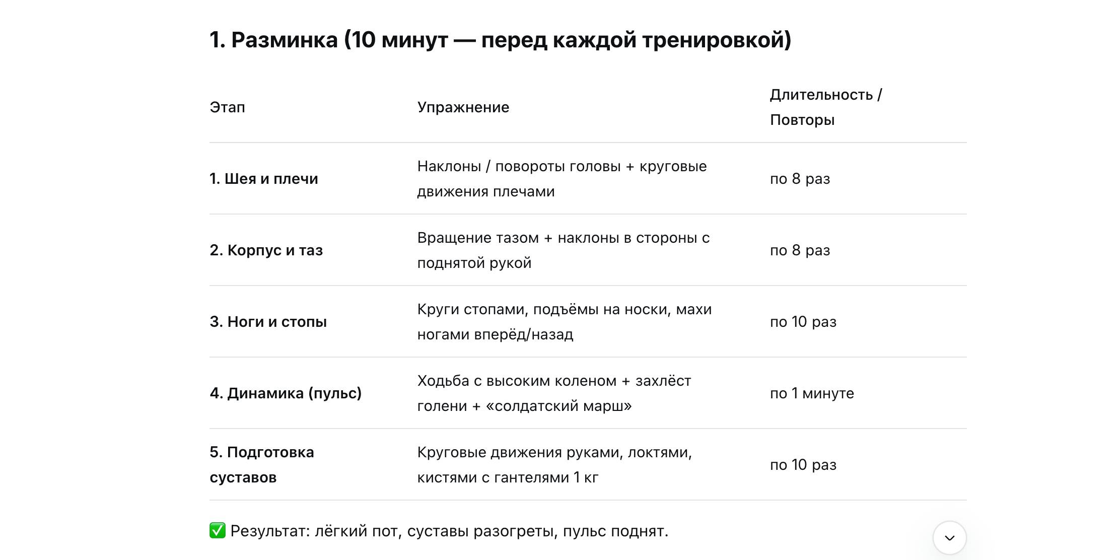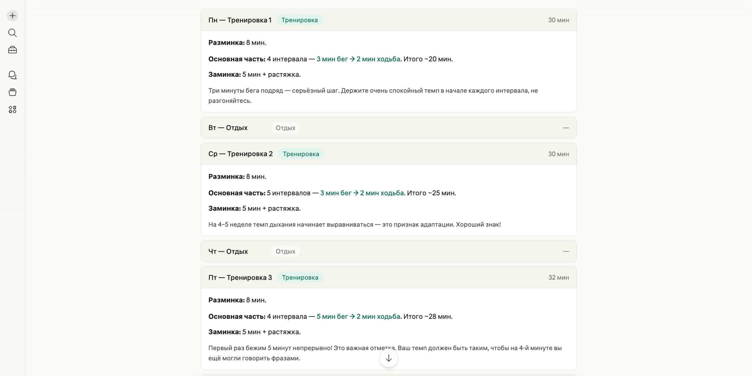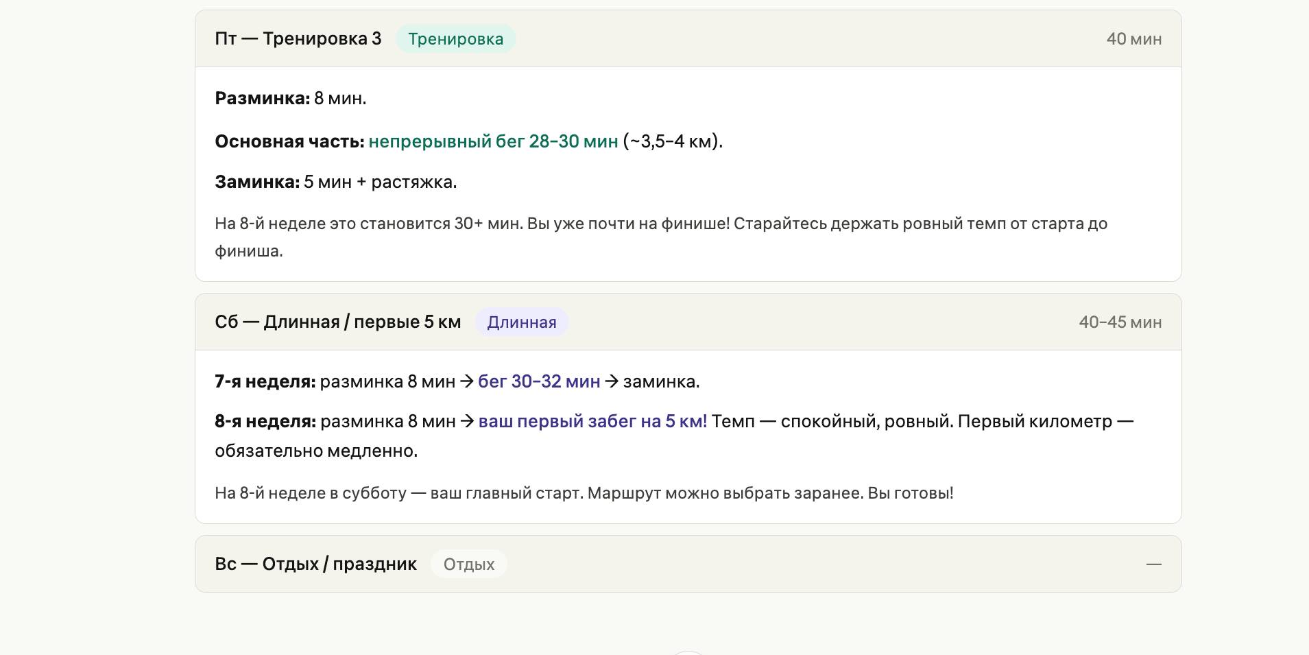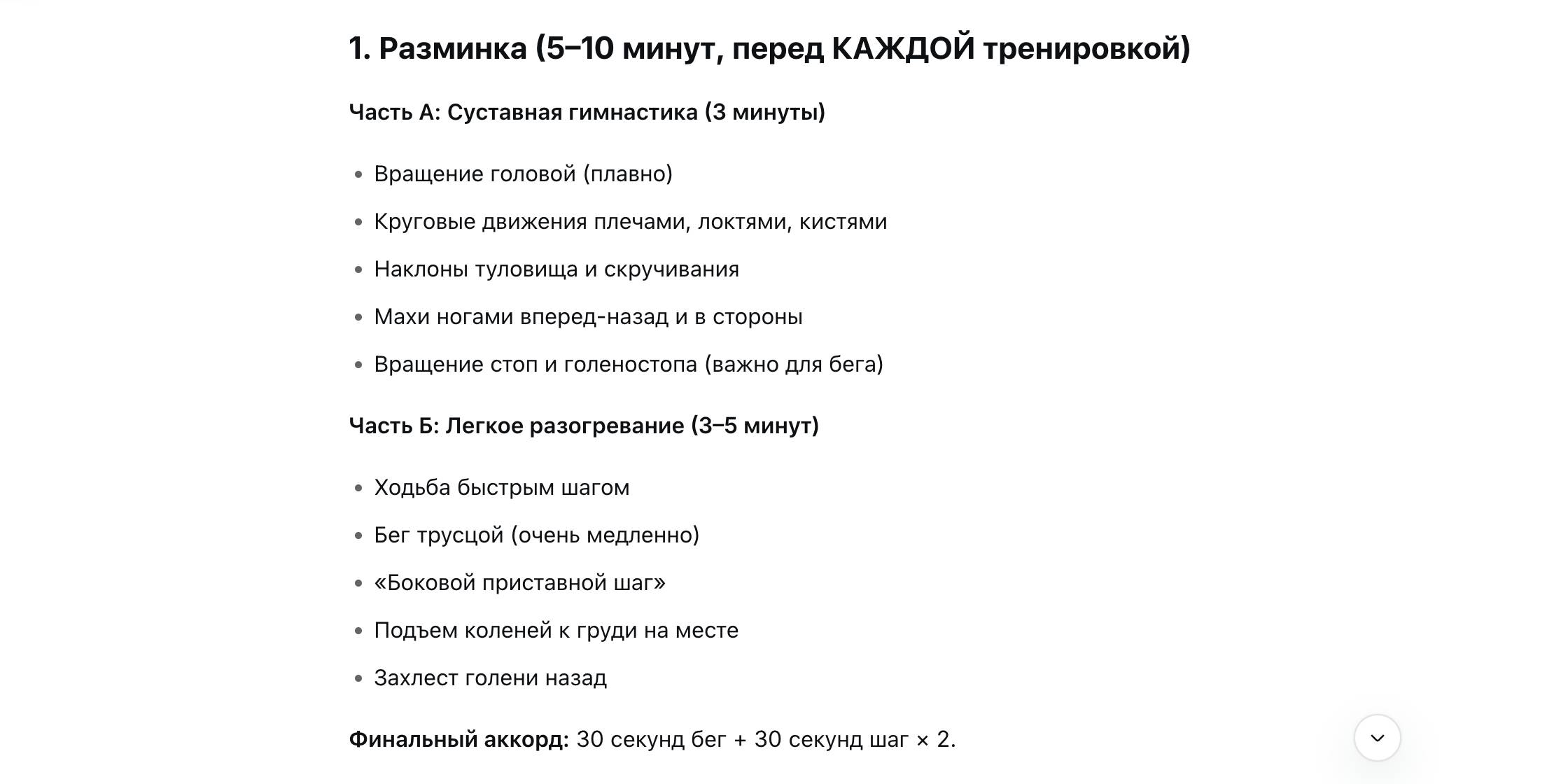 Claude дала более плавную прогрессию нагрузки, чем ChatGPT. В конце каждого тренировочного дня прописана заминка и небольшие полезные советы.