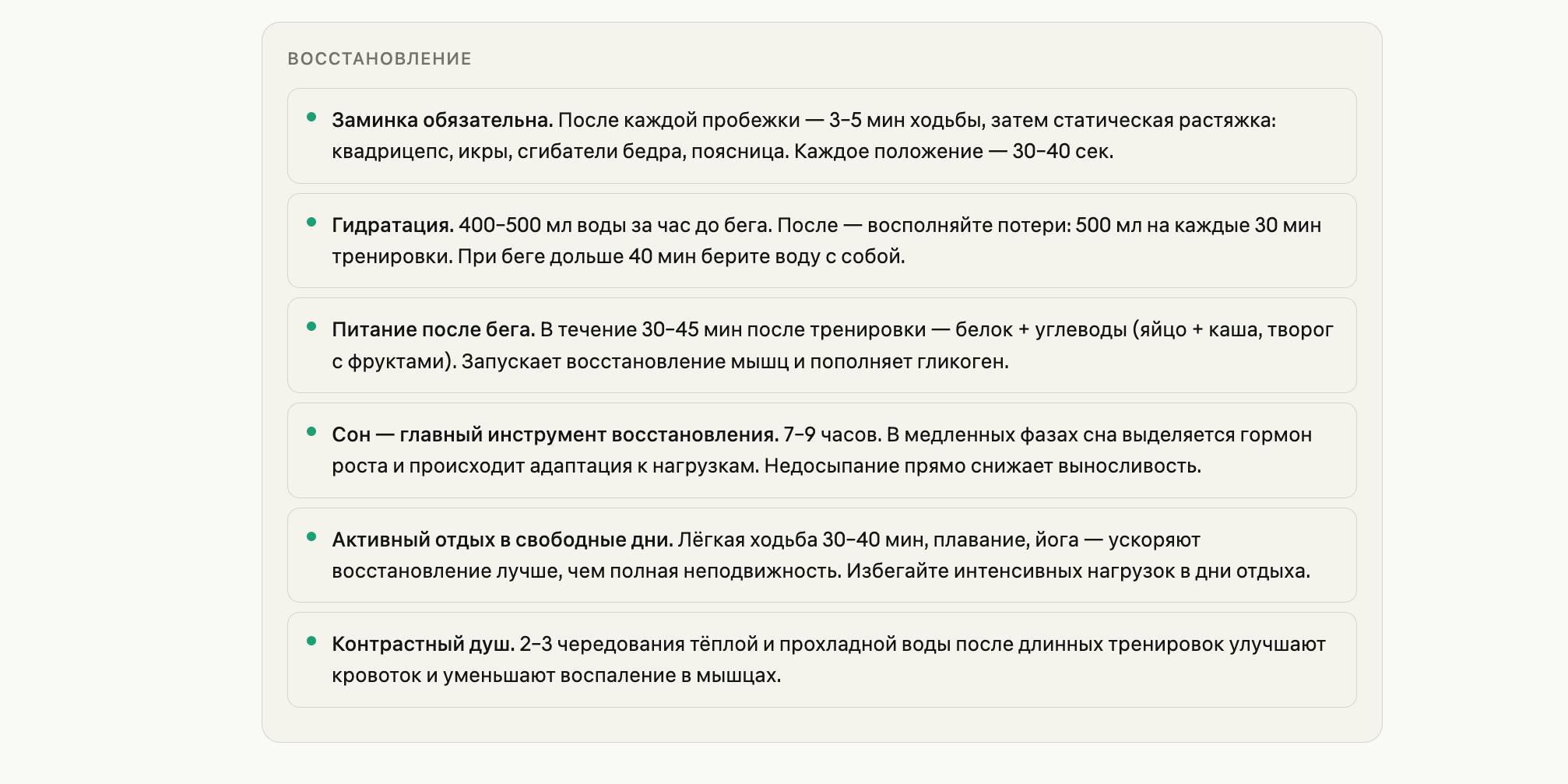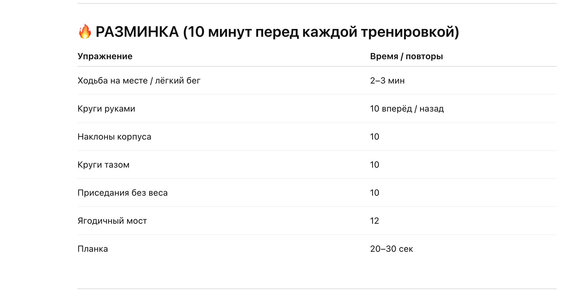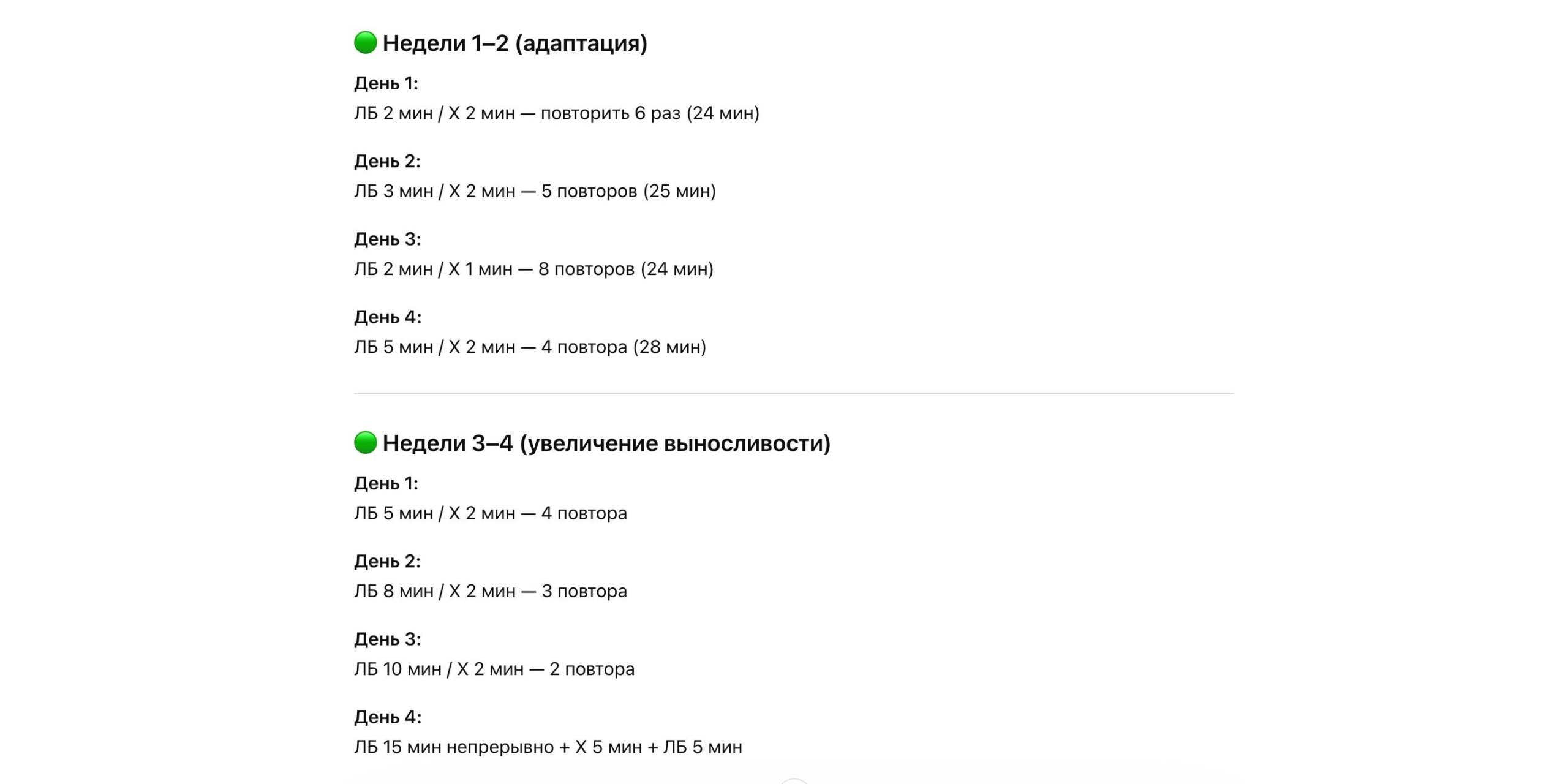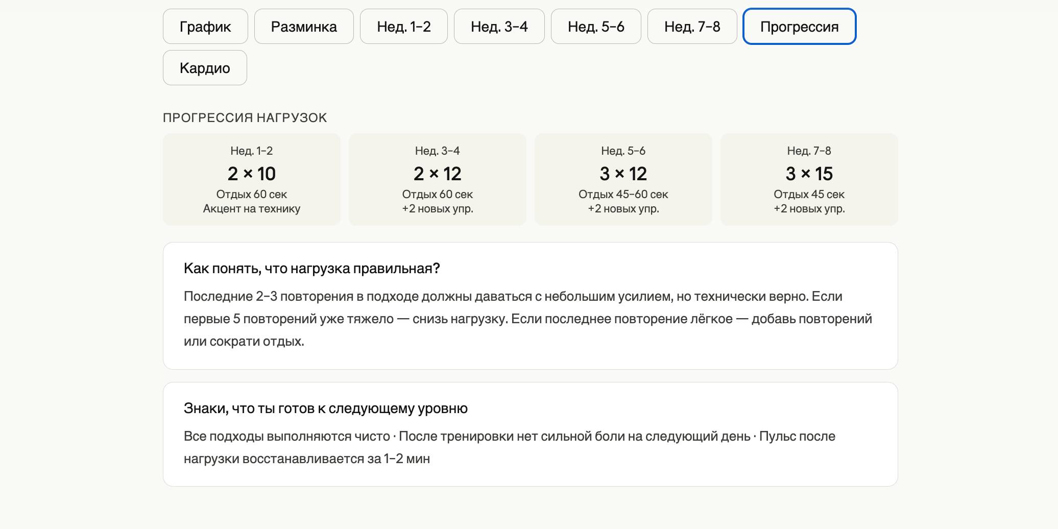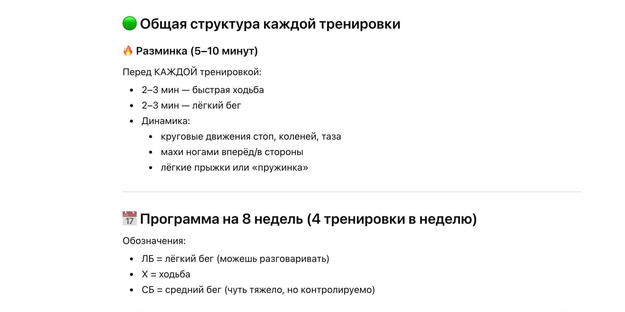 Claude дала более плавную прогрессию нагрузки, чем ChatGPT. В конце каждого тренировочного дня прописана заминка и небольшие полезные советы.