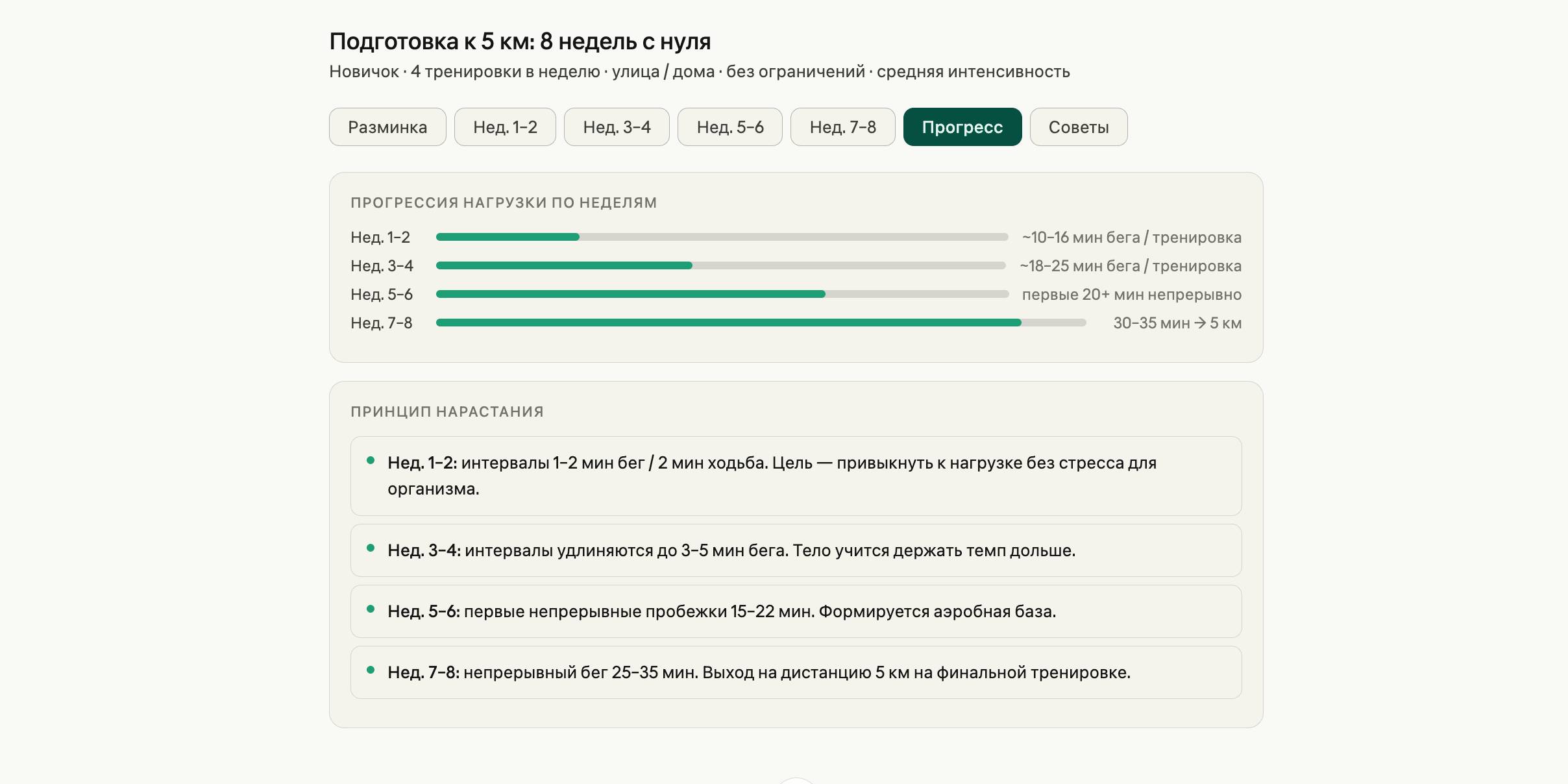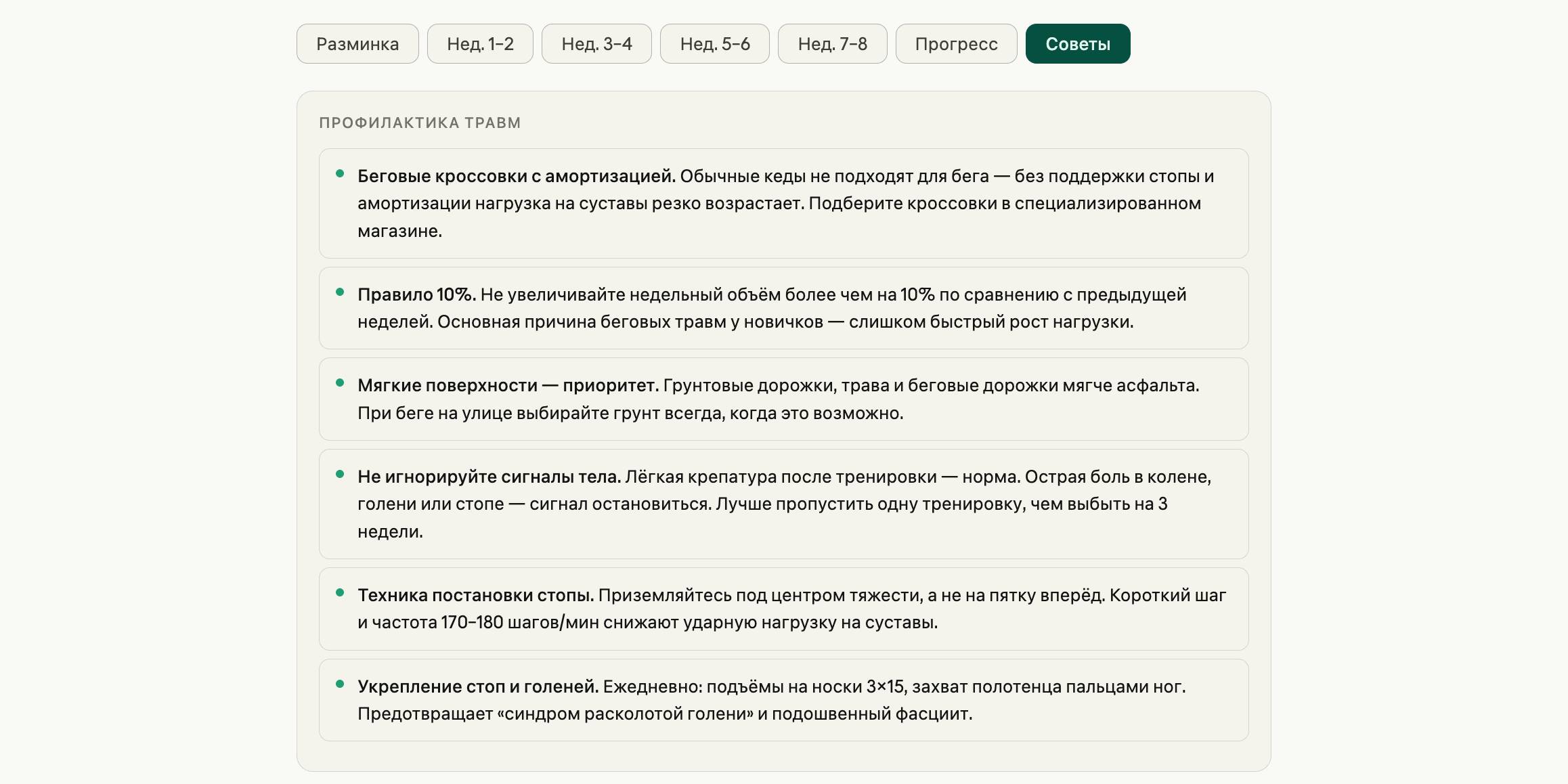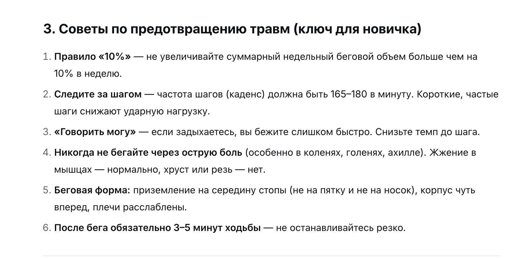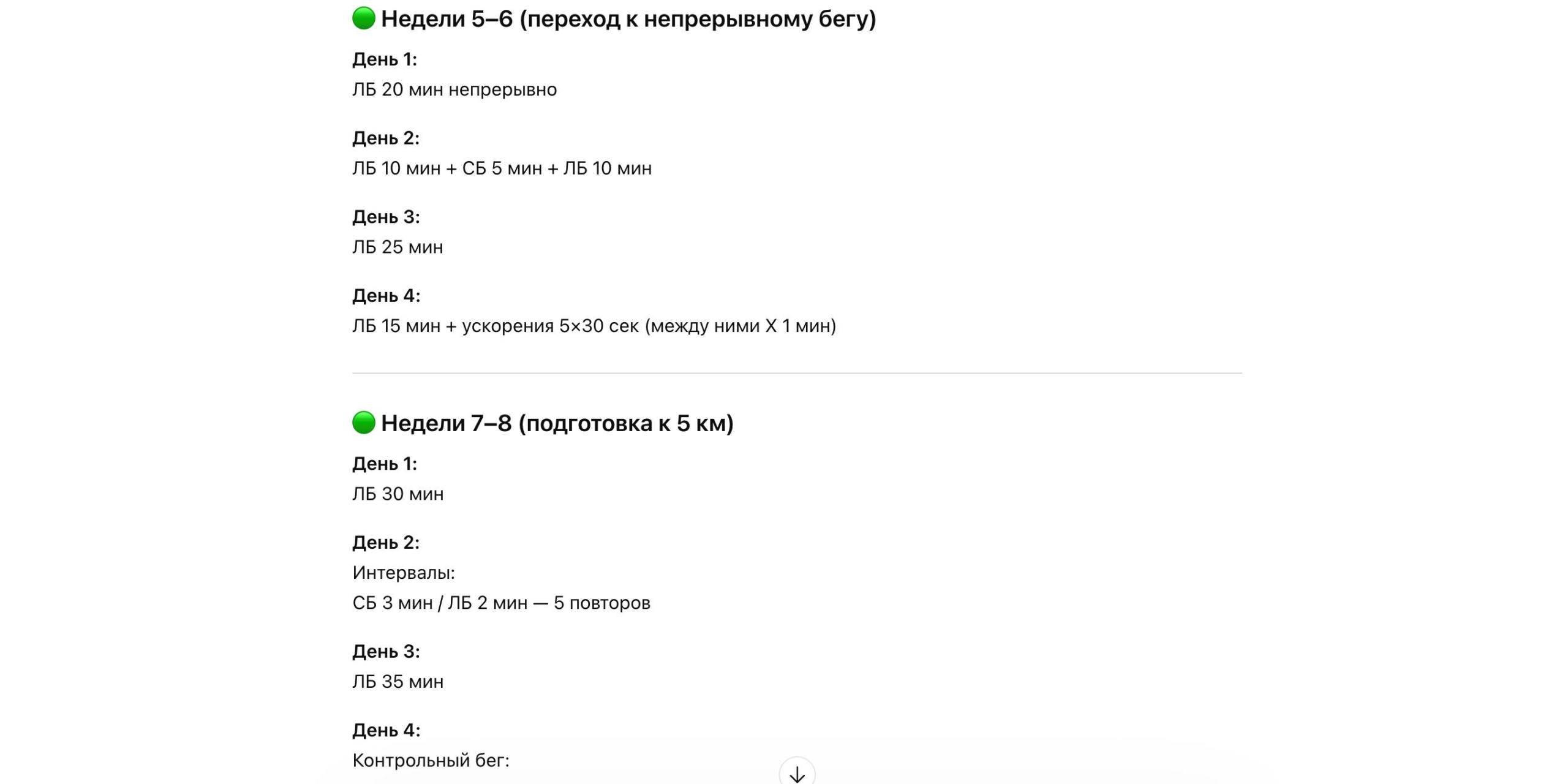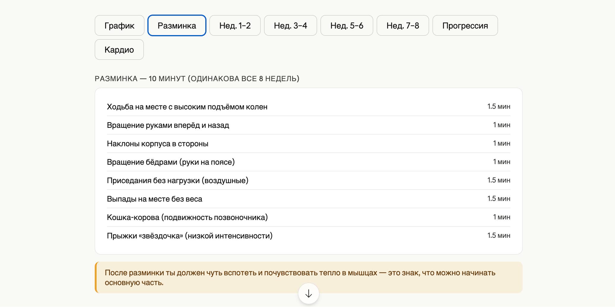 Claude дала более плавную прогрессию нагрузки, чем ChatGPT. В конце каждого тренировочного дня прописана заминка и небольшие полезные советы.