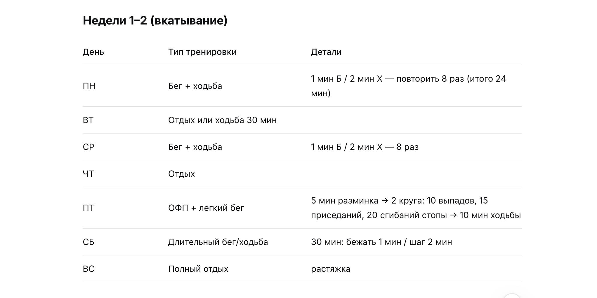 Вот что составила DeepSeek для бегуна-новичка, который хочет подготовиться к первому забегу. Из плюсов — в пятницу кардио сочетается с лёгкими упражнениями на укрепление пресса, спины и бёдер. Такие тренировки могут защитить новичка от боли и немного улучшить его технику.