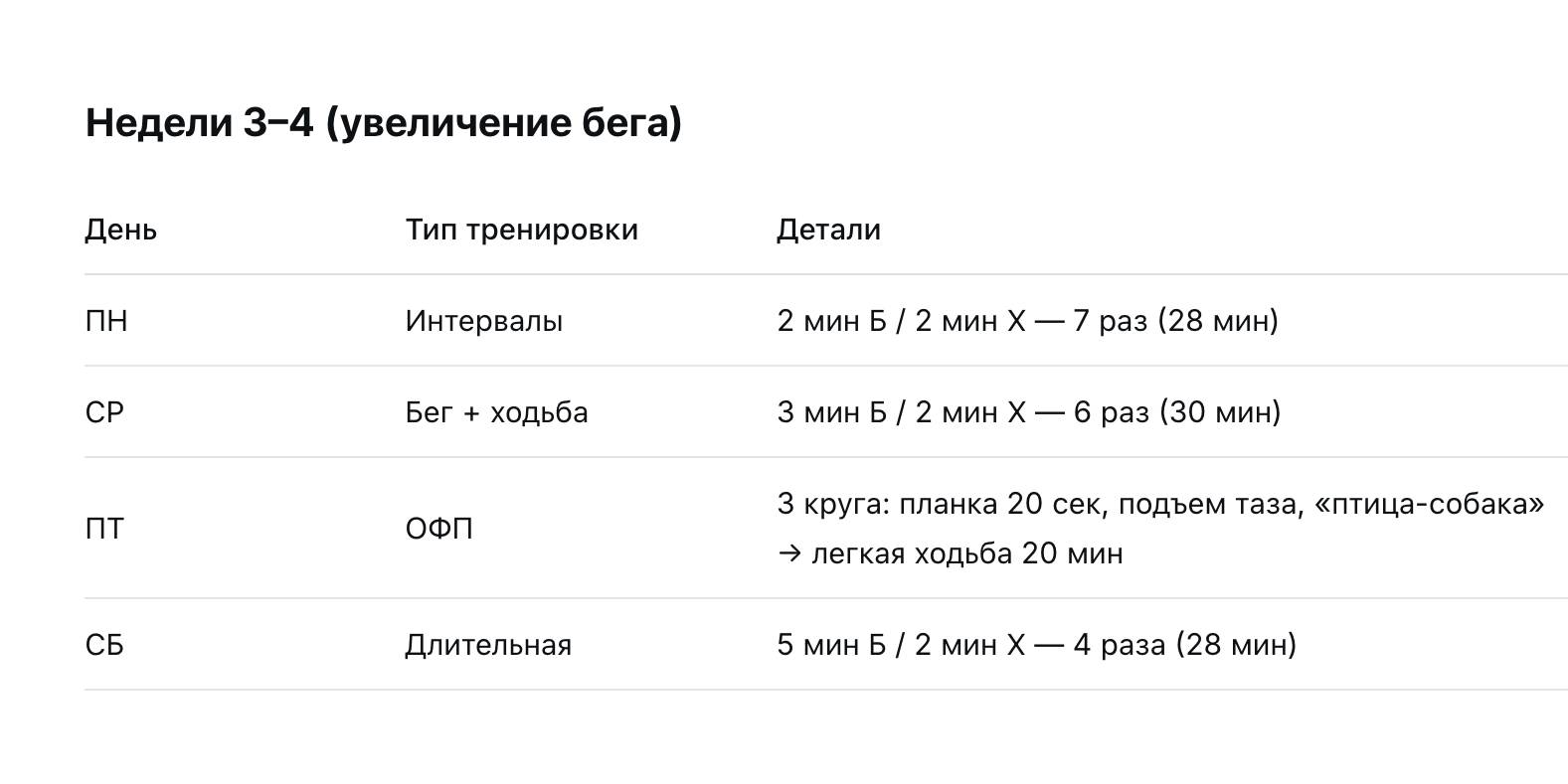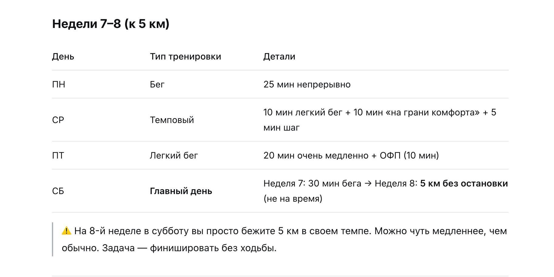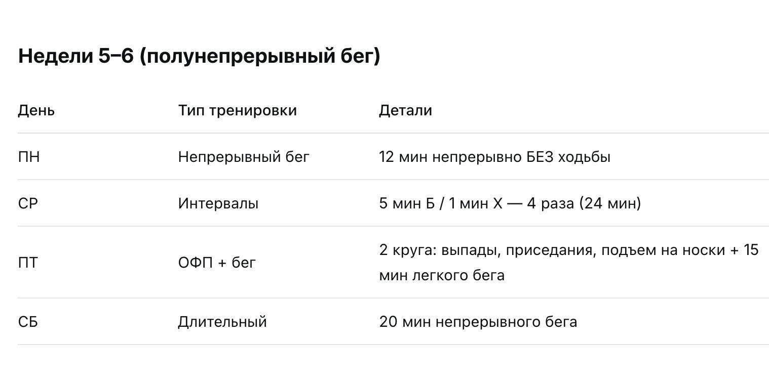 В конце есть наглядная таблица с прогрессом — сколько минут вы будете бегать на каждой неделе. Это помогает отслеживать результат.