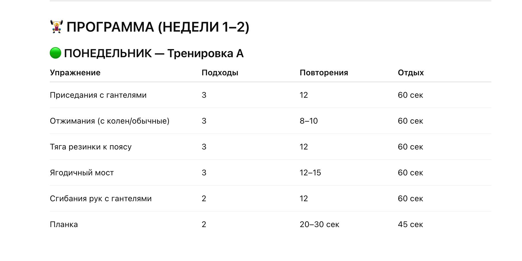 Вот пример того, что может сделать DeepSeek для новичка, который хочет заниматься дома, из оборудования имеет эспандер, гантели и турник.