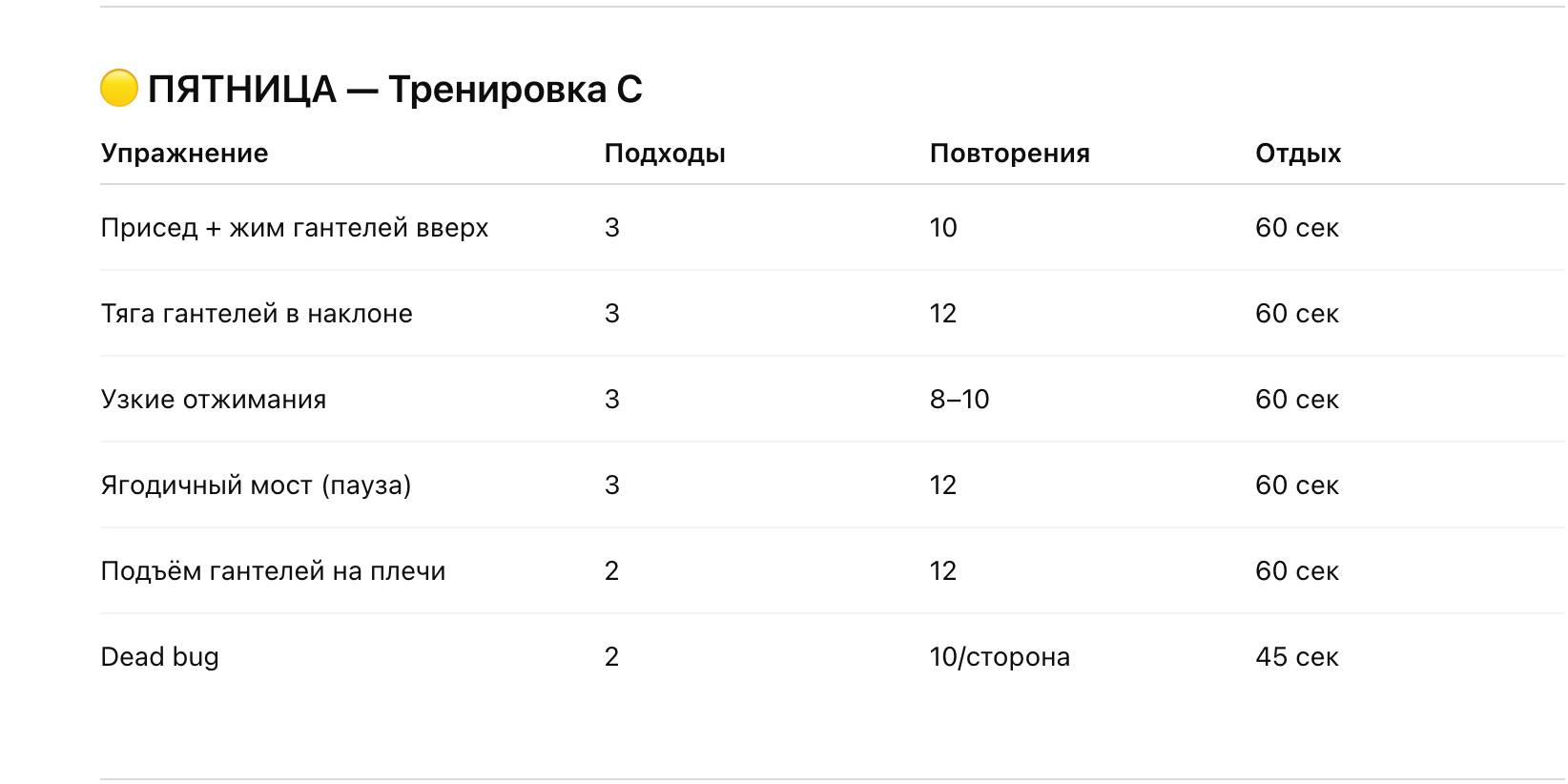 - Конкретные упражнения с указанием подходов, повторений и отдыха.