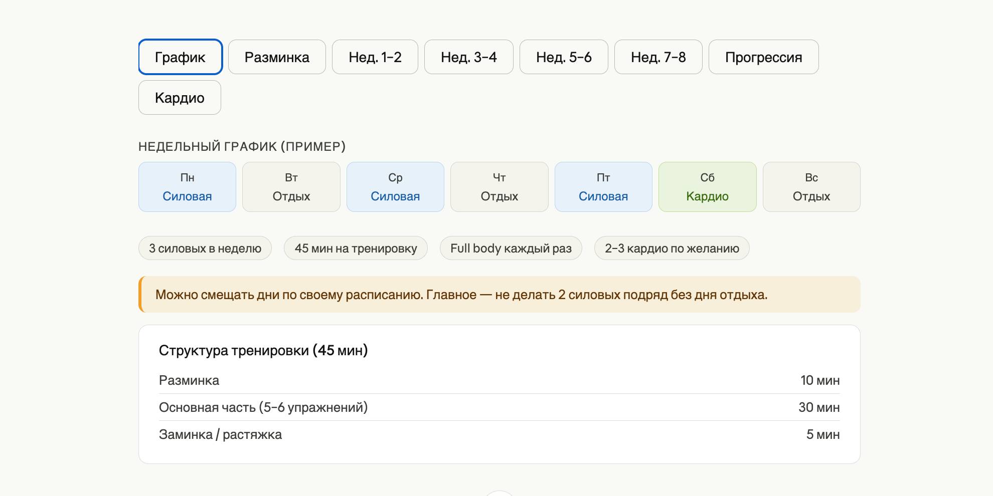 Нам больше всего понравилась программа силовых тренировок от Claude. Она даёт ответ в удобном формате — пользователь может переключаться по вкладкам с неделями, а не листать полотно текста, как в других нейросетях.