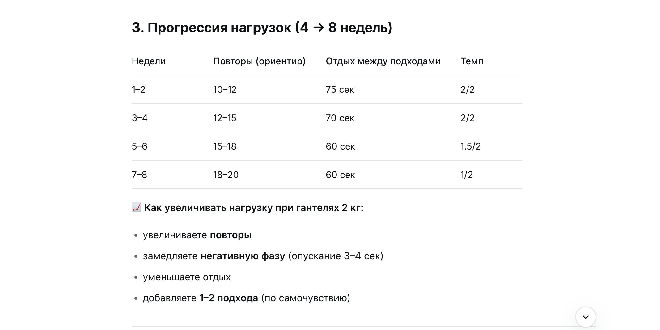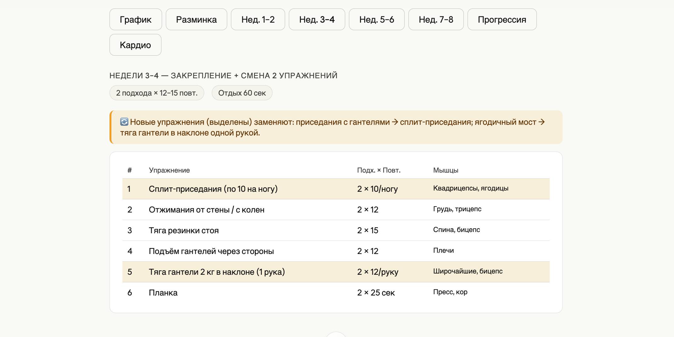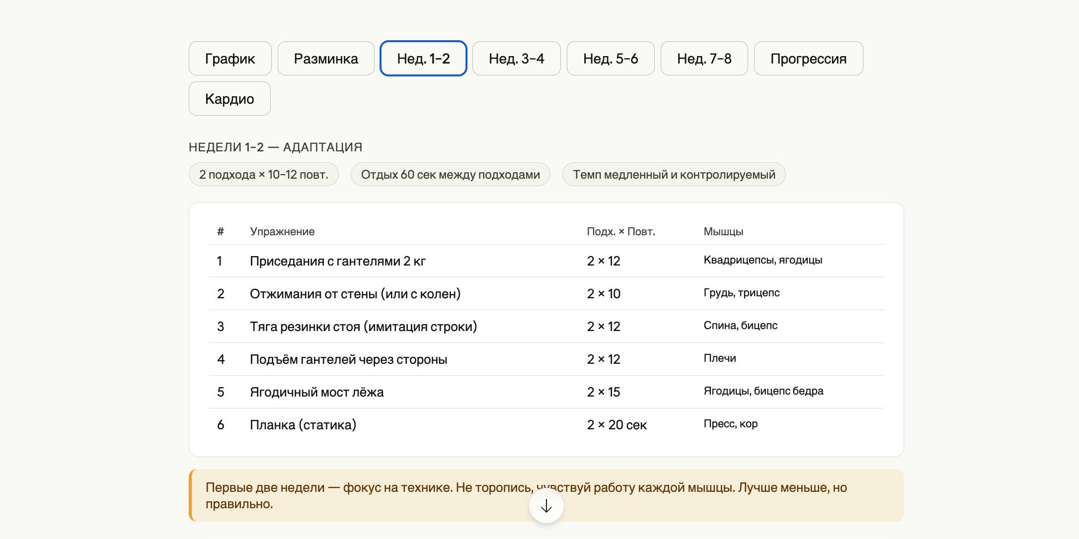 Программа тренировок от Claude примерно совпадает с тем, что предложили другие нейросети. Но при этом Claude дала всего по два подхода каждого упражнения в первые четыре недели. Такое количество может не обеспечить достаточно нагрузки, особенно при условии, что в промпте указаны очень лёгкие гантели. Как следует нагрузить мышцы с ними может быть непросто даже для новичка.