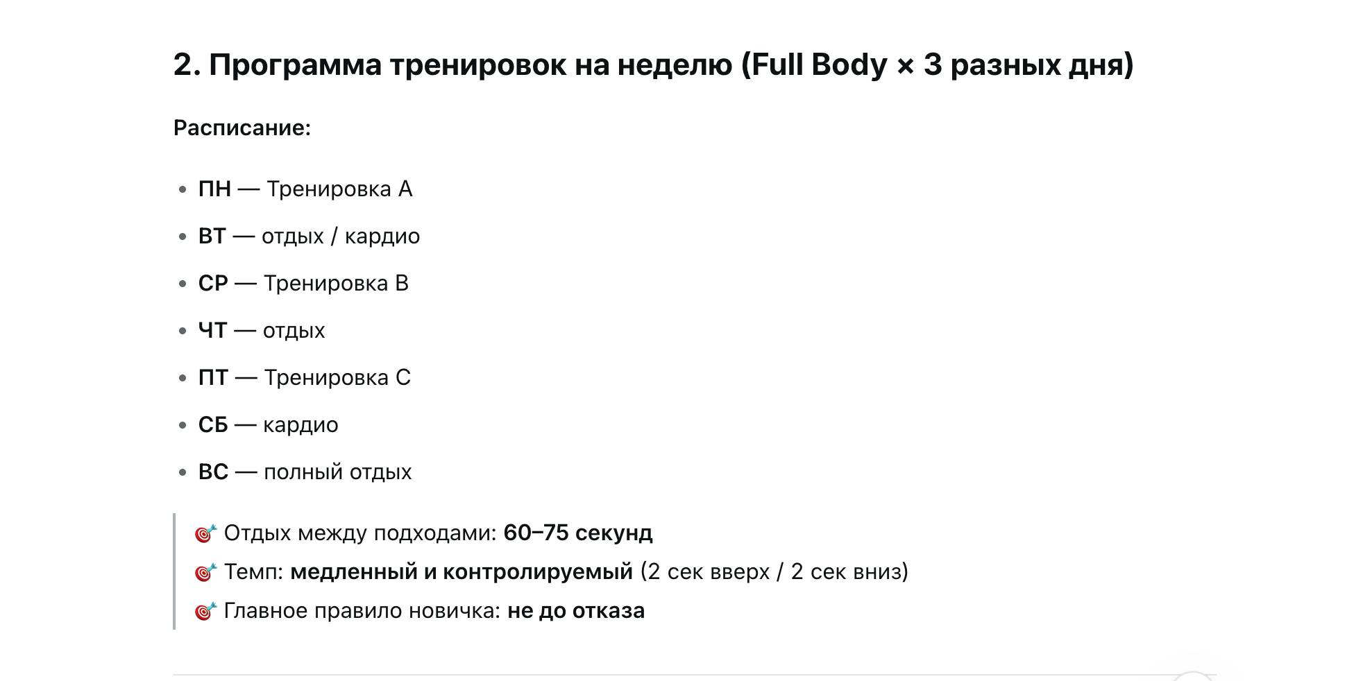 Вот промпт для силовых тренировок новичку. Можете взять его и отредактировать под себя.