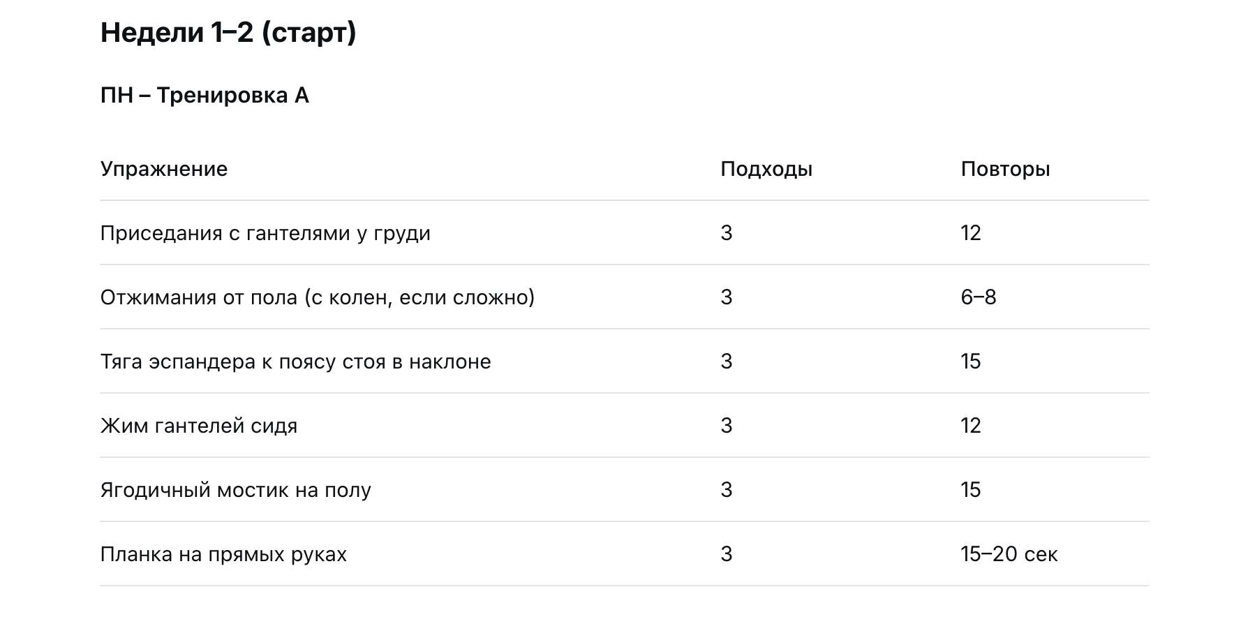 - Уровень подготовки: новичок без опыта силовых тренировок.