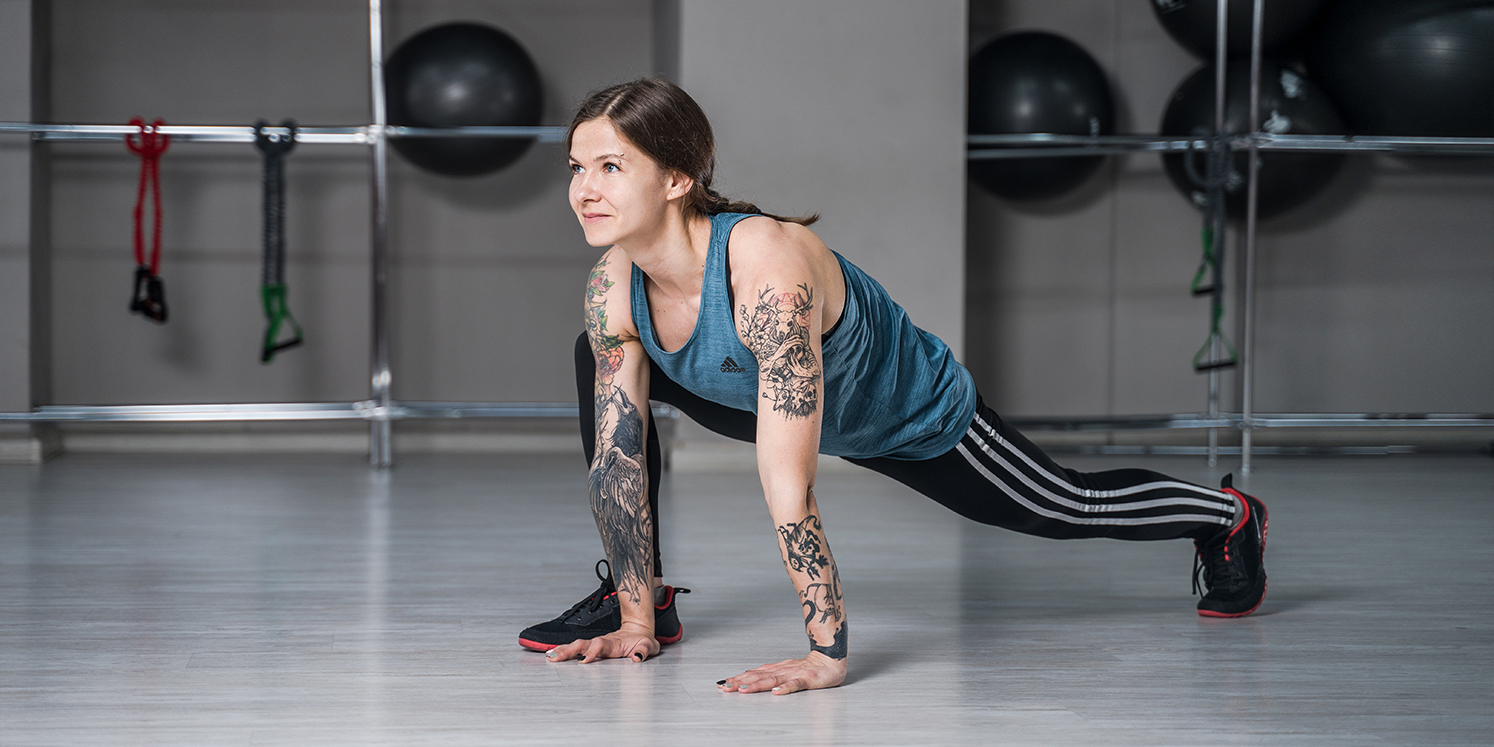 Встаньте в упор лёжа. Согните правую ногу в колене и подтяните её носок ближе к правой руке. Затем с прыжком смените ноги: правую поставьте назад, а левую согните и подведите к руке. Повторите смену ещё раз и вернитесь в упор лёжа.