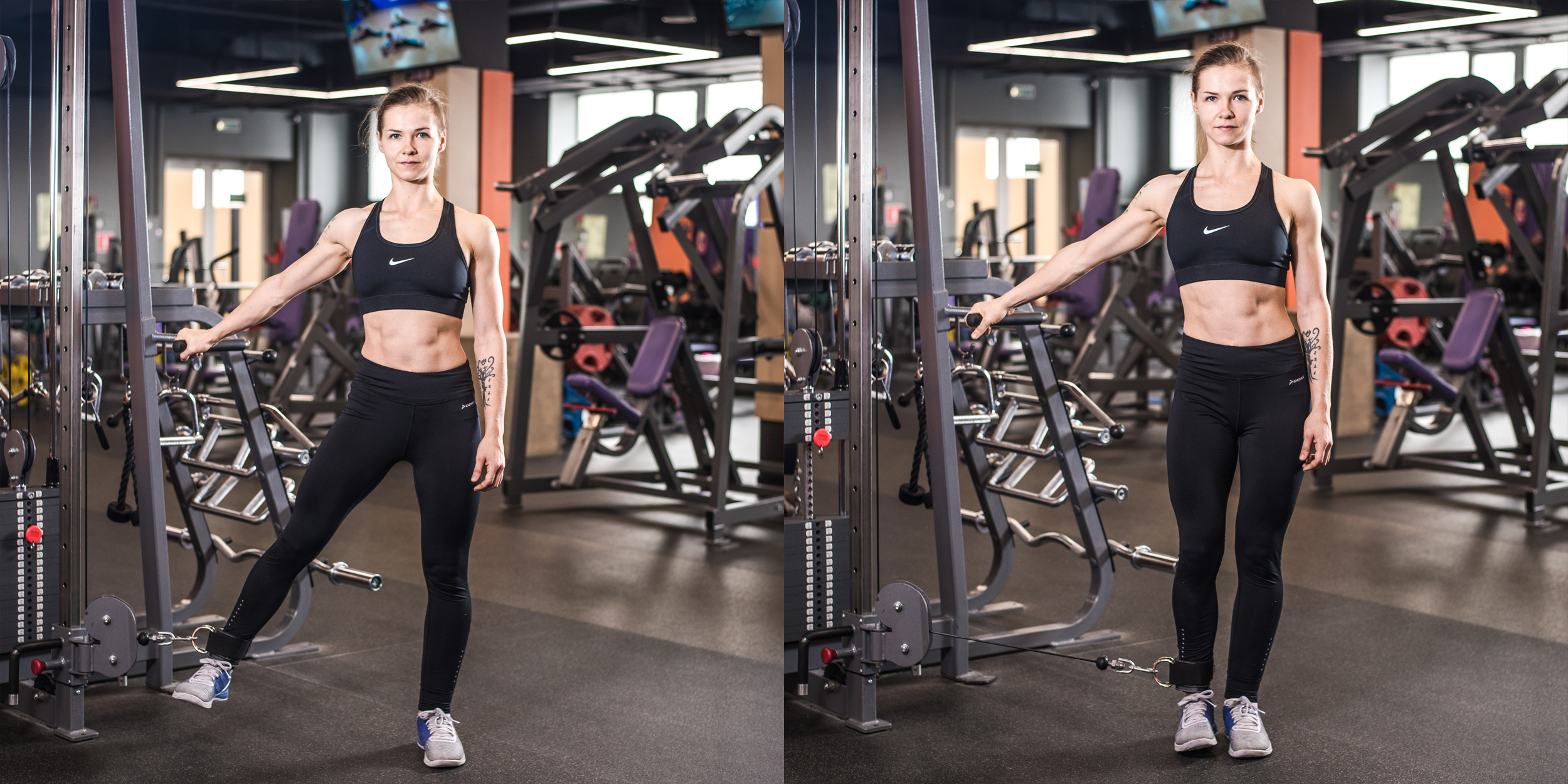 Наденьте манжету кроссовера на правую щиколотку и встаньте в шаге от нижнего блока правым боком к нему. Отведите рабочую ногу в сторону. Преодолевая сопротивление тренажёра, приведите правую ногу к левой, вернитесь в исходное положение и повторите. Когда закончите подход, выполните с другой ноги. Теперь крепление будет на левой ноге и вы будете стоять левым боком к блочному тренажёру.