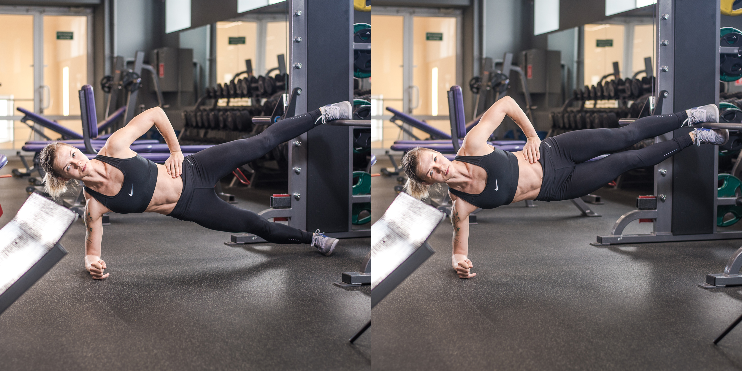 Встаньте в боковую планку на локте, положите щиколотку верхней ноги на возвышение или засуньте в петлю. Либо попросите партнёра держать вас за бедро и щиколотку.