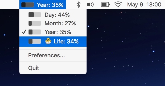 Аналогичный счётчик можно поместить в строку меню macOS с помощью приложения Progress Bar OSX. Оно позволяет посмотреть в процентах, какая часть года, месяца или дня осталась позади. Правда, приложение платное — за него придётся выложить пять долларов.