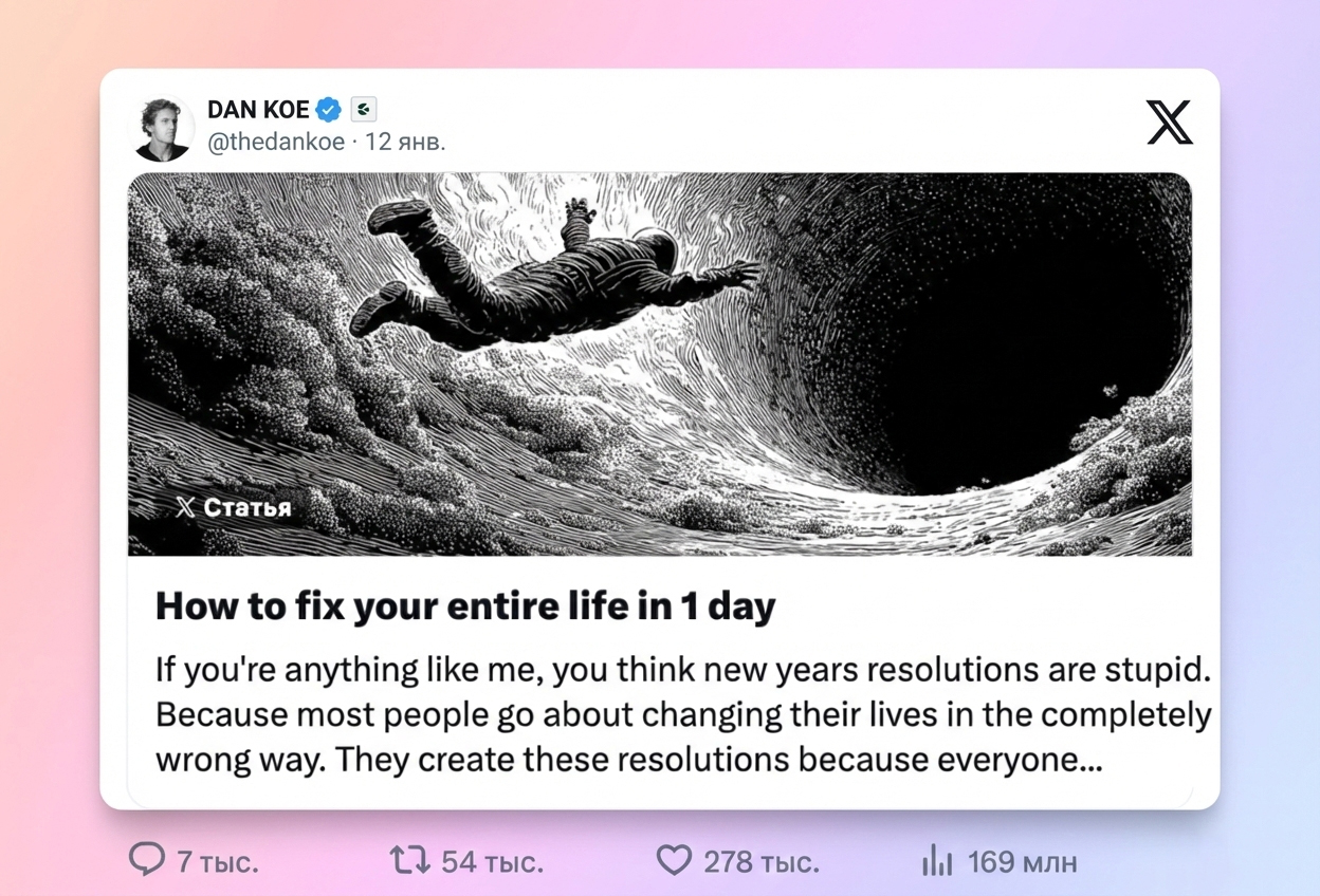 Американский блогер и мотивационный автор Дэн Коу в Х длинную статью о том, как можно повысить мотивацию за один день. За несколько дней пост набрал более 169 миллионов просмотров и свыше 7 тысяч комментариев.