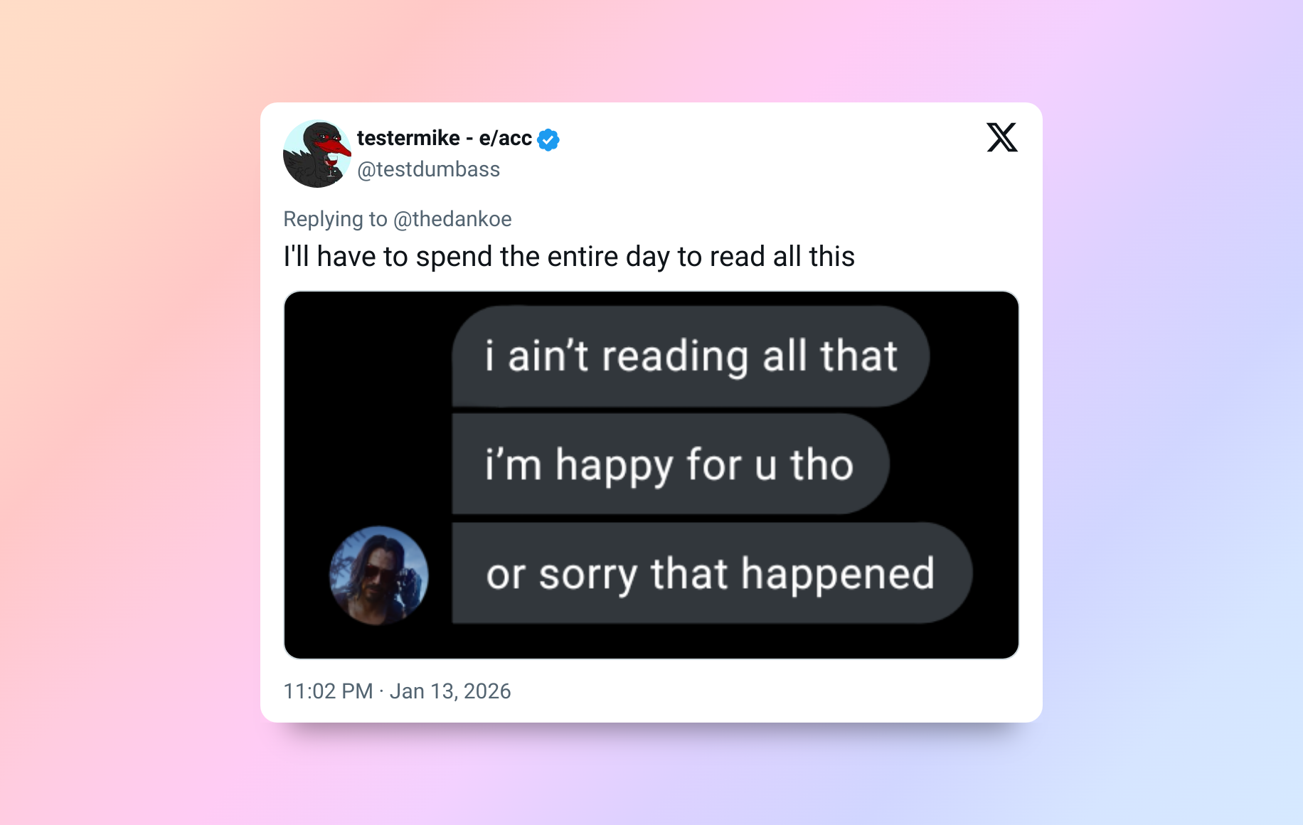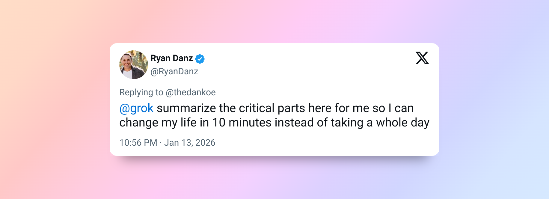 Мнение пользователей о пользе такой методики разделились. Некоторые не удержались от откровенного стёба, как Ryan Danz: «Grok, кратко изложи мне ключевые моменты, чтобы я мог изменить свою жизнь за 10 минут, вместо того чтобы тратить на это целый день».