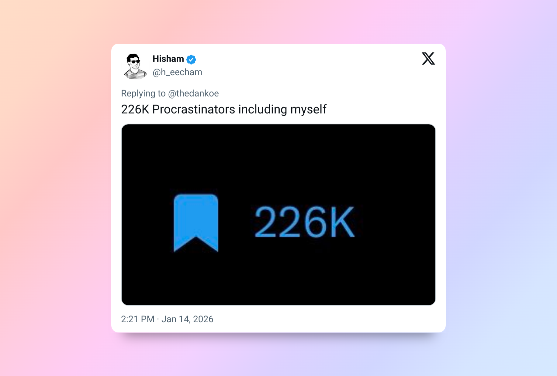 Один из пользователей обратил внимание, сколько раз пост отправили в закладки, чтобы почитать его позже (или никогда): «226 тысяч человек, откладывающих дела на потом, включая меня».
