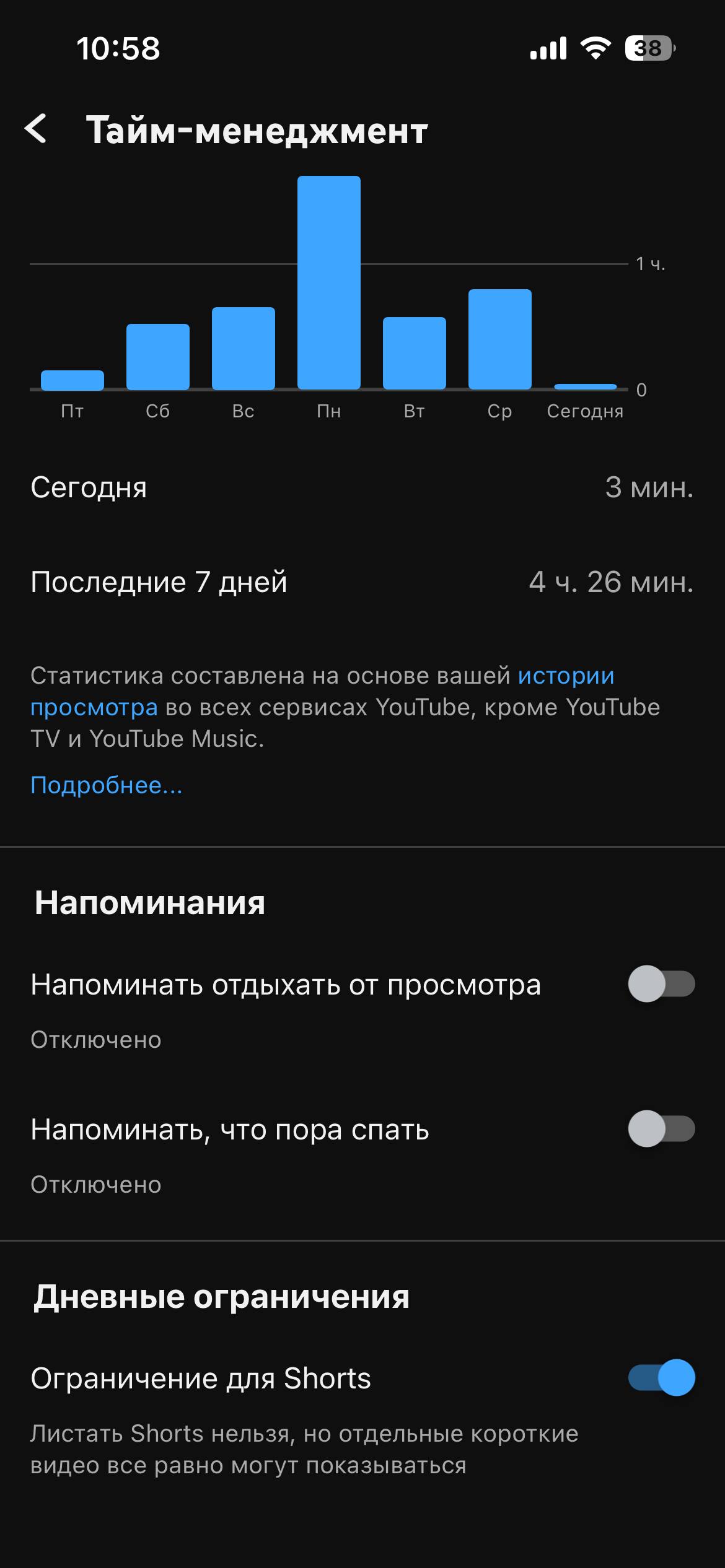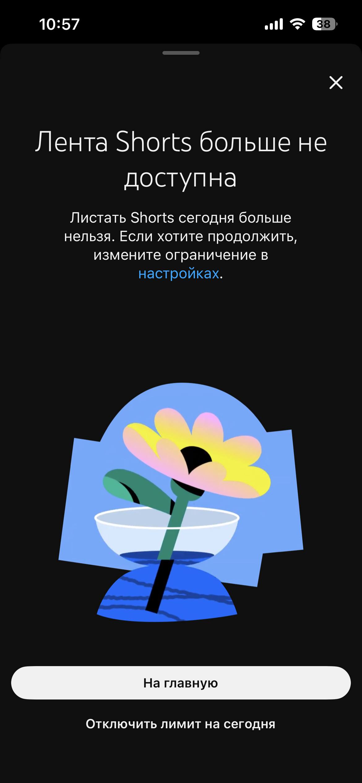 После активации настройки контент во вкладке Shorts перестанет загружаться. На экране будет появляться сообщение о достижении лимита — правда, возможность его проигнорировать по-прежнему останется. Зато с главного экрана приложения короткие ролики исчезнут — но, по словам компании, изредка всё же будут появляться.