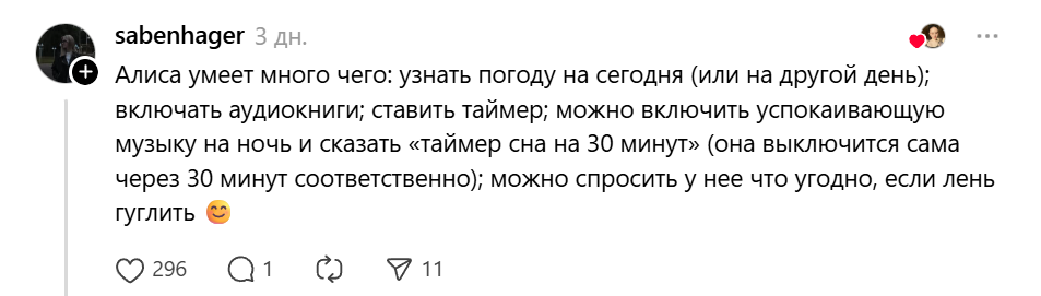 Включить музыку на «Яндекс Станции» или попросить «Алису» рассказать, какая за окном погода, может каждый. Но у колонки есть и менее очевидные функции — и пользователи соцсетей с радостью ими поделились.