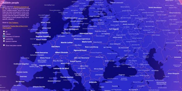 Финский географ Топи Чжуканов, сотрудник американской картографической компании Mapbox, создал интерактивную карту, на которой пометил места рождения выдающихся личностей со всего мира из разных исторических эпох.