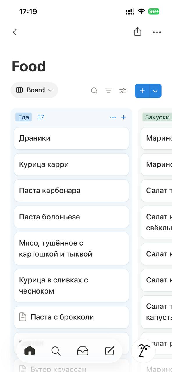 В целом можно обойтись и списком. Большинство карточек еды у меня всё равно имеют только название, так как я помню, что там внутри. Карточный формат выручает в случае сложносоставных блюд, для которых всё же нужен рецепт или список продуктов, чтобы мучительно не вспоминать, что входит в какой-нибудь вальдорфский салат.