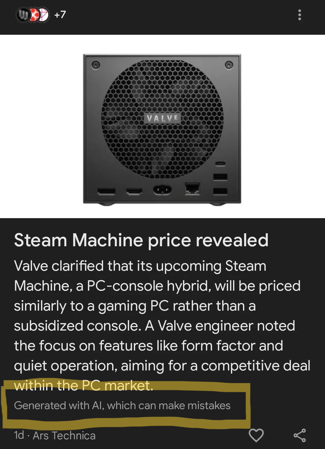 Стоит отметить, что Google добавляет к таким тайтлам пометку Generated with AI, which can make mistakes («Создано с помощью искусственного интеллекта, который может совершать ошибки»). Правда, она видна только при нажатии кнопки «Подробнее», что делают немногие. В результате пользователи могут решить, что их любимые издания стали прибегать к откровенному кликбейту.