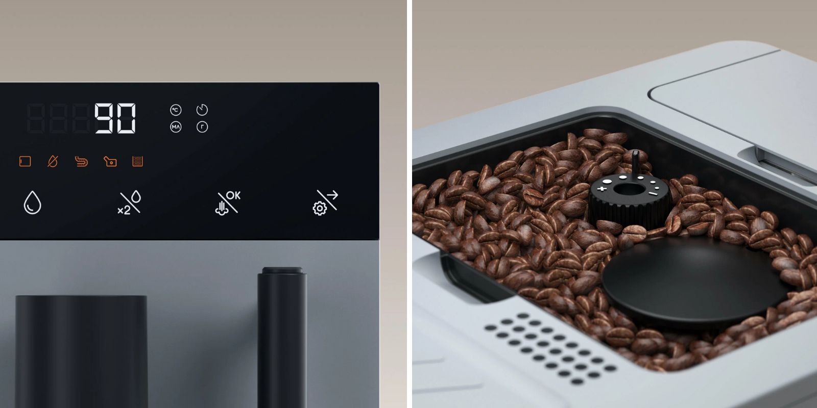 Управление здесь сенсорное, а для любителей экспериментов установлена кофемолка с регулировкой помола. Для приготовления напитка с воздушной молочной пеной предусмотрен встроенный капучинатор.