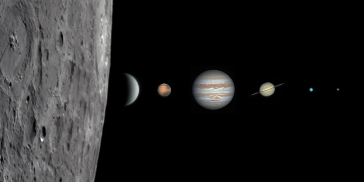 На снимке представлены (слева направо): Луна, Венера, Марс, Юпитер, Сатурн, Уран и Нептун.