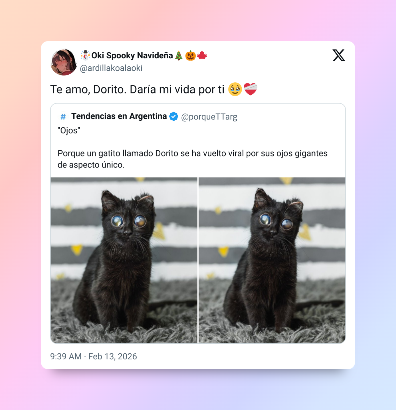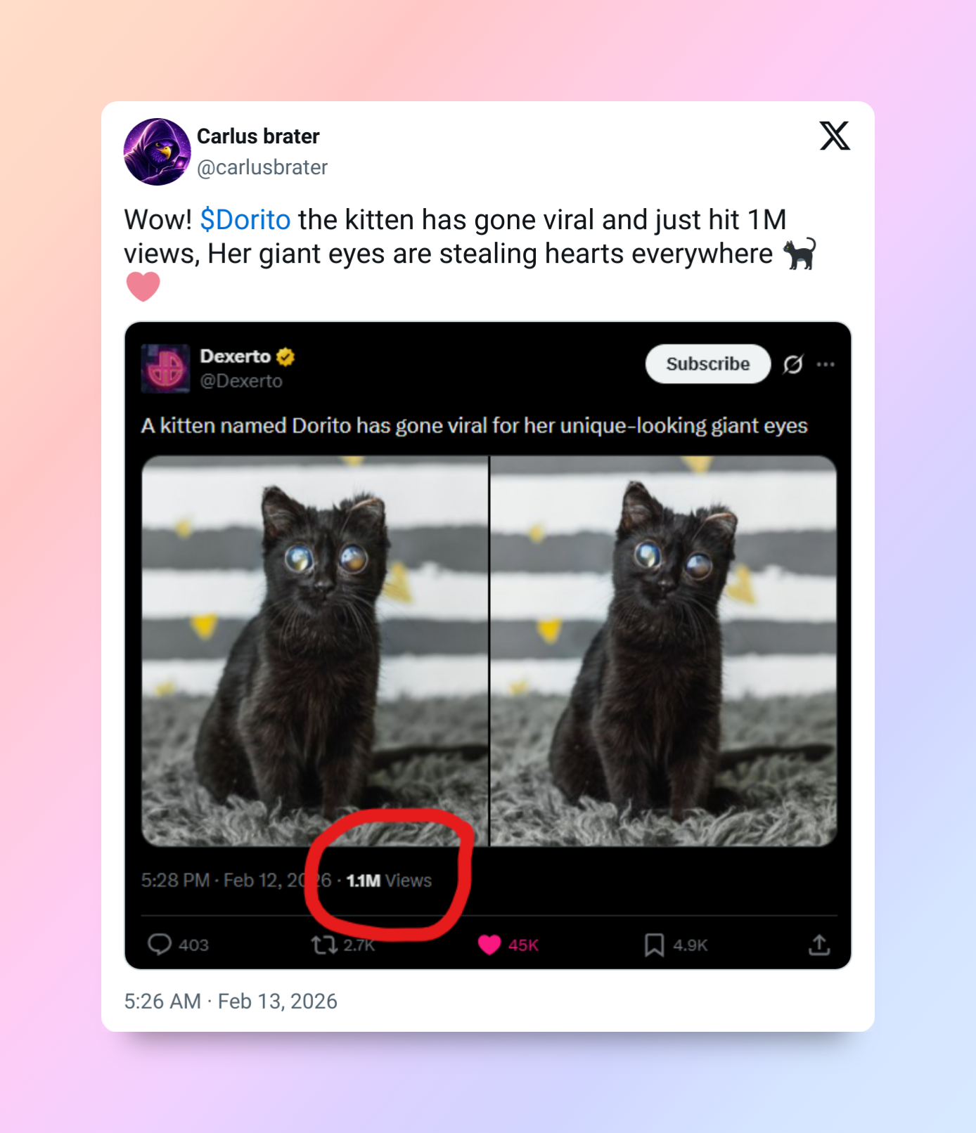 «Вау! Дорито стал вирусным и набрал уже миллион просмотров. Ее огромные глаза покоряют сердца повсюду 🐈⬛ 🩷».