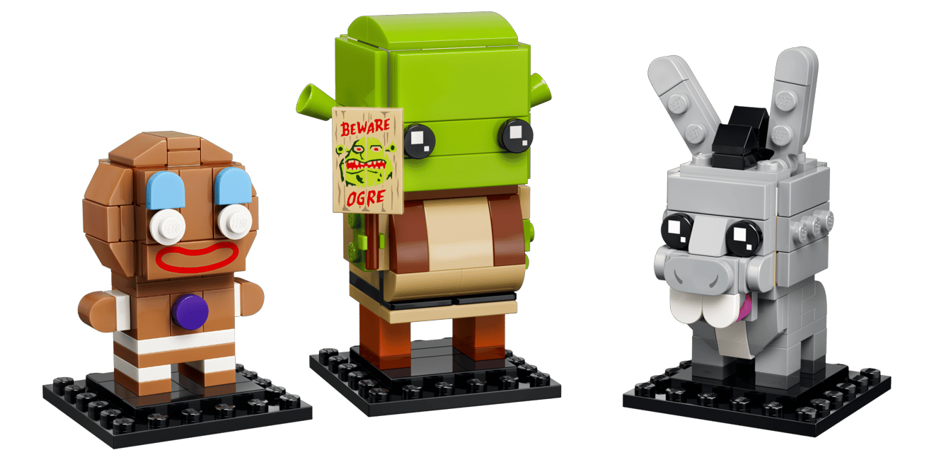 Для тех, кто предпочитает формат поменьше, выйдет трио BrickHeadz: Shrek, Donkey & Gingy. В этот комплект за 25 долларов (≈1 900 рублей) вошли стилизованные версии Шрэка, Осла и Пряни. У героев можно менять положение ушей, а в руки протагонисту можно дать знаменитую табличку «Осторожно, огр!».