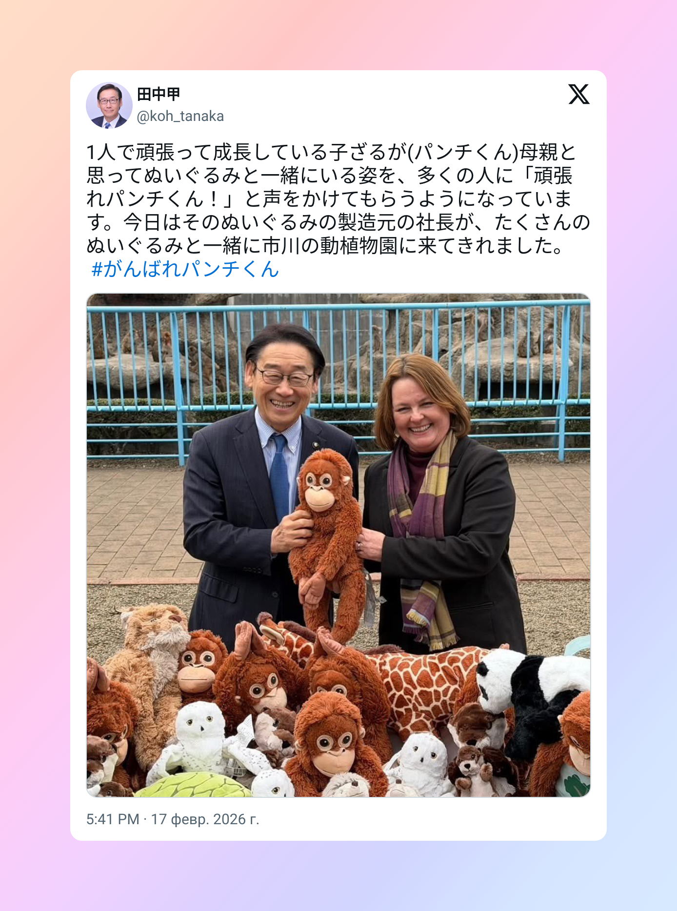 Детёныш макаки Панч рос в одиночку, прижимаясь к плюшевой игрушке, которую принял за маму. Этот образ растрогал многих — люди стали говорить ему: «Держись, Панч!». Сегодня в знак поддержки в зоопарк Итикавы приехала президент компании-производителя этой игрушки и привезла с собой множество таких же плюшевых зверушек.