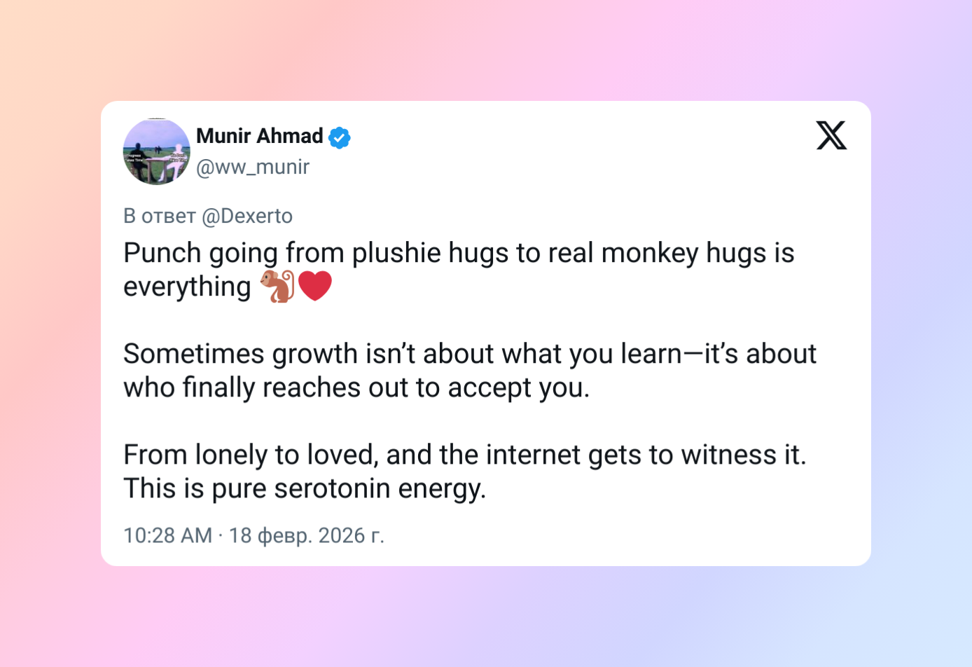 Панч прошёл путь от объятий с плюшевой игрушкой к объятиям с настоящими макаками — и в этом, кажется, весь смысл. Иногда взросление — это не про то, чему ты научился, а про то, что кто-то наконец тянется к тебе и принимает. От одиночества к принятию — и весь интернет стал свидетелем этого. Настоящая порция серотонина.