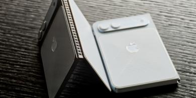 При раскрытии появляется 7,7‑дюймовый экран формата 4:3 — ближе к iPad mini, чем к привычным телефонам. На задней панели расположены две горизонтальные камеры в блоке, как у iPhone Air. Кнопки и порты пока выглядят условно, но предполагается наличие Action Button.