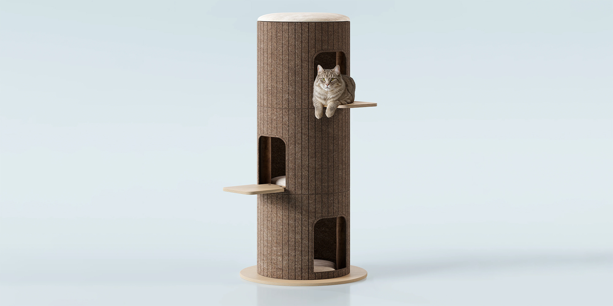 Компания Meowpy представила ёлку, которая одновременно служит когтеточкой и домиком для кошек. Конструкция состоит из четырёх уровней с уютными подушками и скрытыми проходами, в которых животные могут лазить, прятаться и просто отдыхать.